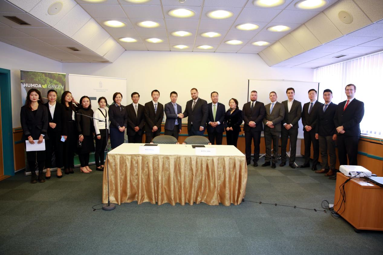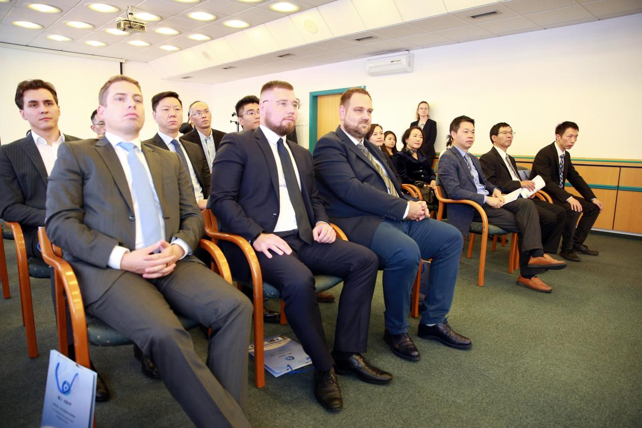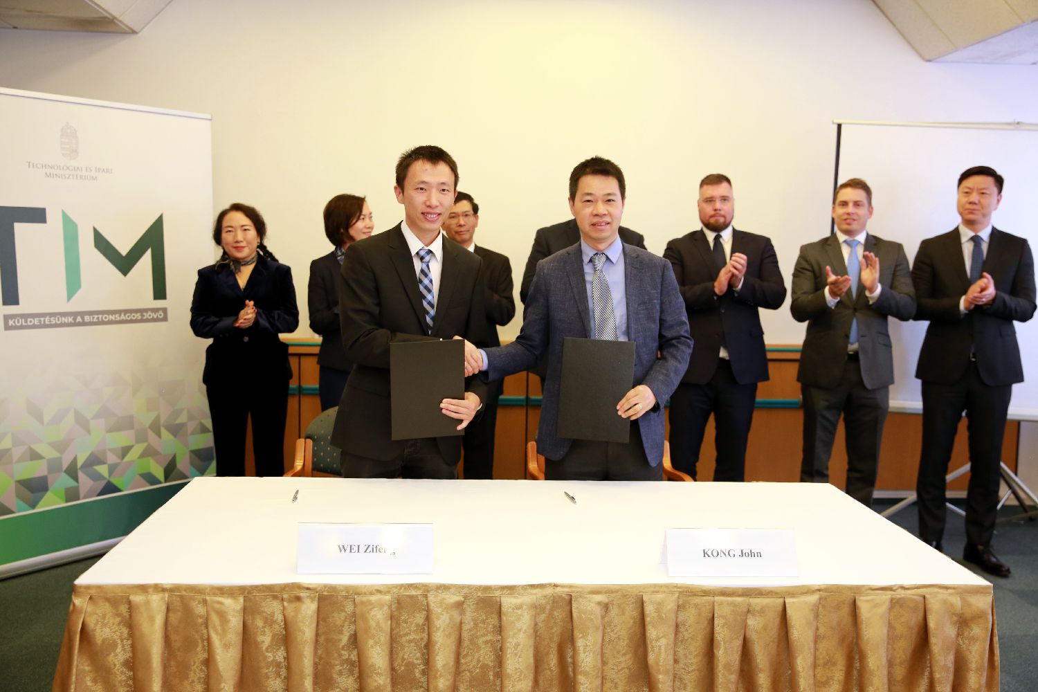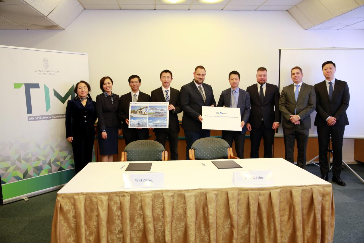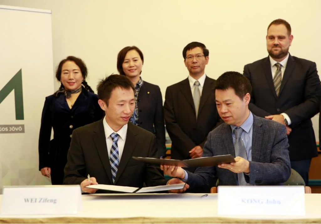 签约仪式在匈牙利科技与工业部国务秘书高若·鲍拉日(后右一)、中国驻匈使馆经商处一秘冯春(后右二)和部分中资企业代表的见证下顺利进行 / 摄影:新导报记者 文采
