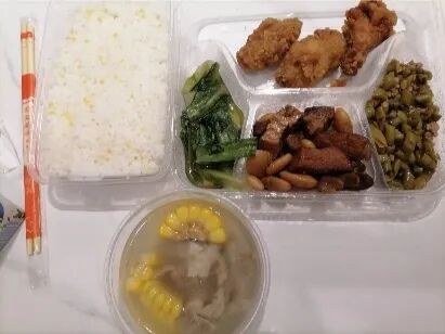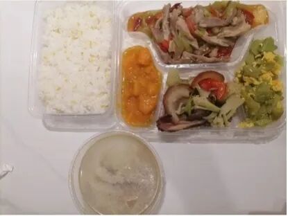 早餐时间7:30-9:00,午餐11:30-23:00,晚餐17:30-19:00,工作人员把餐食放在门口的椅子上,自行拿取。第一天的隔离生活很幸福,从床上睁开眼睛就开始期待餐食,事实证明川菜果然没有让我失望,对于我这种“嗜辣星人“非常友好(当然青菜都是不辣的),可以称得上是色香味俱全且营养均衡(饭量可观的小编基本全部光盘),早餐图片来自小谢同学(小编自知早起无能因此早早给工作人员打了报告申请取消早餐),据她反馈早餐量非常大,用料良心,尤其是粥和咸菜受到小谢同学连连夸赞。