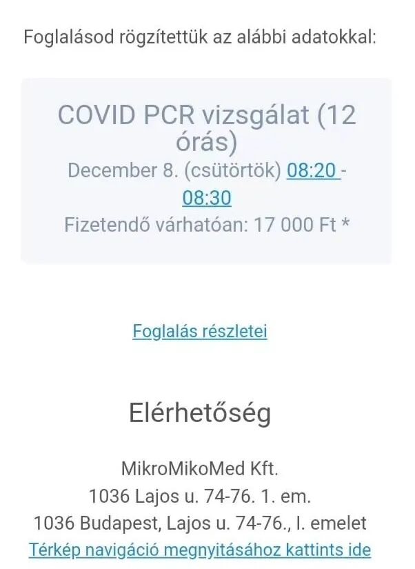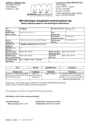 按预约时间前往检测点,出示预约邮件在助理引导下填一个表,其中包括身份信息和检测项目等,一定要确认好姓名,护照号和邮箱!(最后检测结果发到邮箱)。我们选择的是RT-PCR鼻拭子+咽拭子12小时内出结果,费用17,000福林,先检测后交钱,支持现金和刷卡。全程用时不超过十分钟。可以根据自己的需要,选择出结果的时间,出结果速度越快价格也就越高。小编一行人早晨8:30做完核酸检测,下午16:40就收到了检测结果报告: