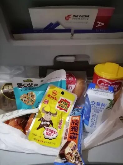 飞机上按照旅客数量提前在位置上放好了餐食,种类很丰富,包括矿泉水、面包、酸奶、坚果等(甚至还有重庆特产灯影牛肉)!