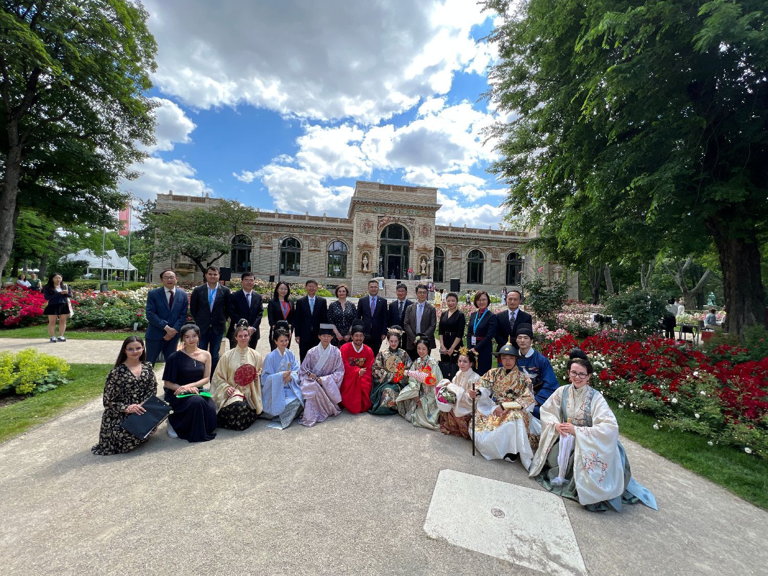 其中,“苏州文旅体验日”部分在千禧之家室外玫瑰花园举办。来自匈牙利、巴西、中国的志愿者身着具有苏州丝绸、刺绣、宋锦等非遗元素的定制款汉服率先登场,配合着“苏州好风光”的乐声,带匈牙利观众“穿越”回明代繁华的江南水乡……活动以精彩的汉服秀开场,以锦衣华服再现古城苏州温婉典雅的古典风韵。现场还设置了丰富的苏州非遗文化体验活动,桃花坞木版年画印制、年画填色、宋锦香囊缝制、宋锦钥匙包制作、碧螺春品鉴等活动吸引了大量布达佩斯市民驻足体验。