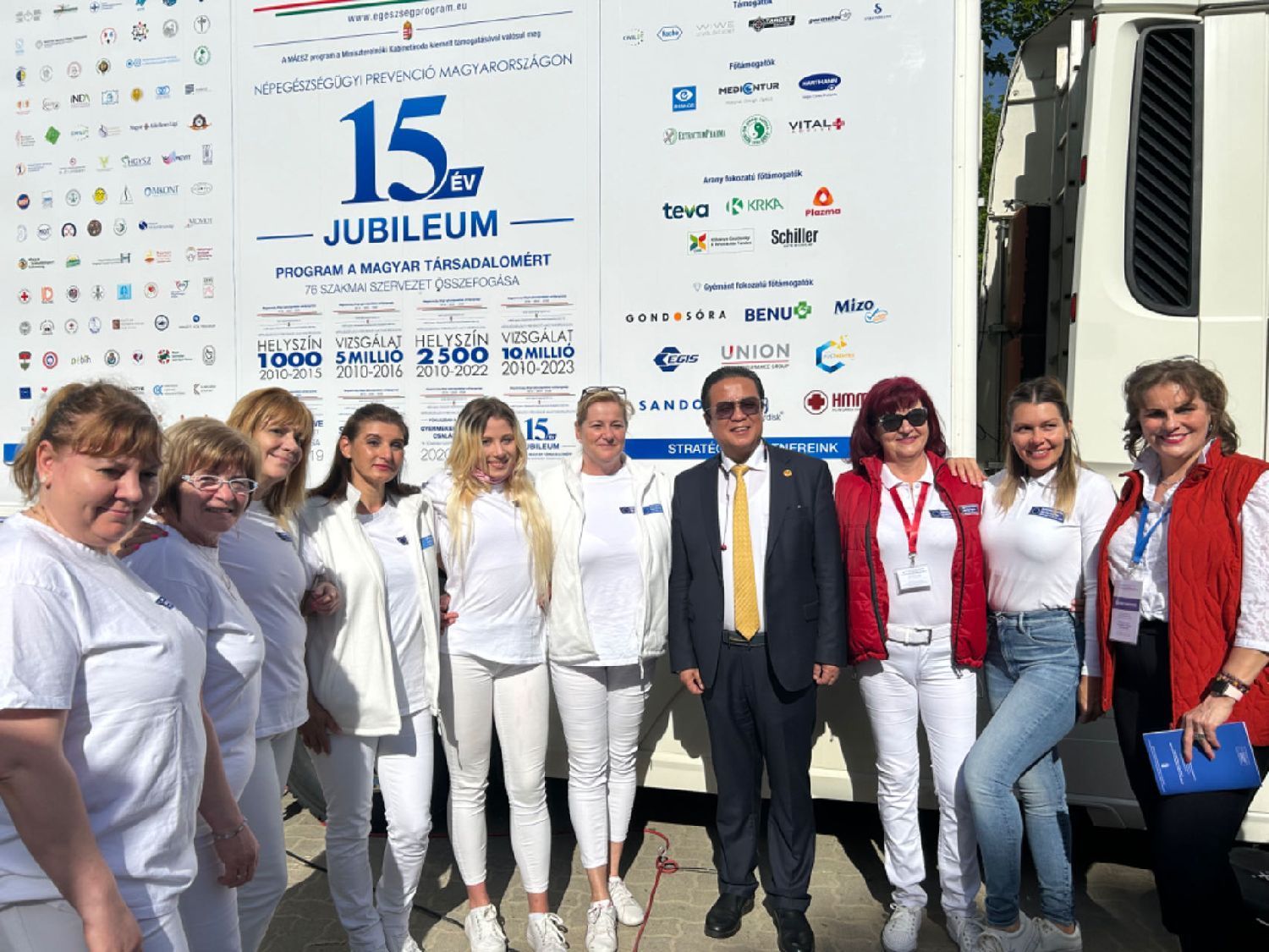 中东欧中医药学会会长、匈牙利东方国药集团董事长陈震博士和参加大健康义诊活动的匈牙利医护人员们合影。