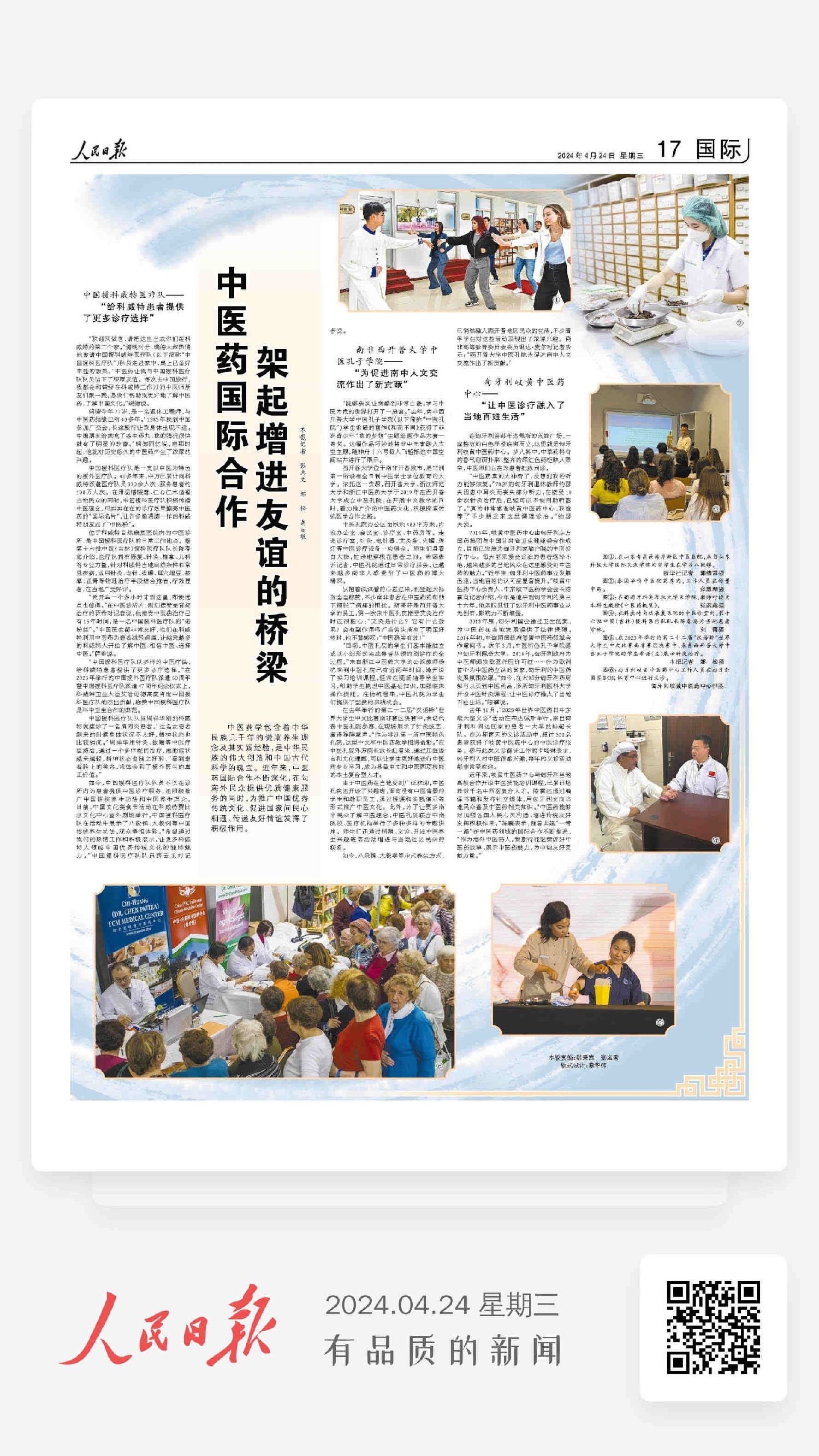 新导报讯:2024年4月24日,《人民日报》用整版刊登《中医药国际合作架起增进友谊的桥梁》文章,着重报道了在匈牙利中医诊疗融入了当地百姓生活的成果: