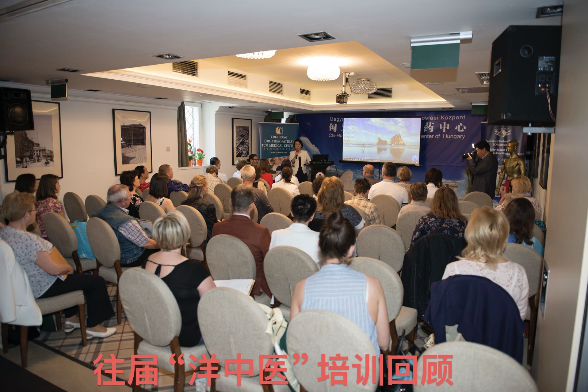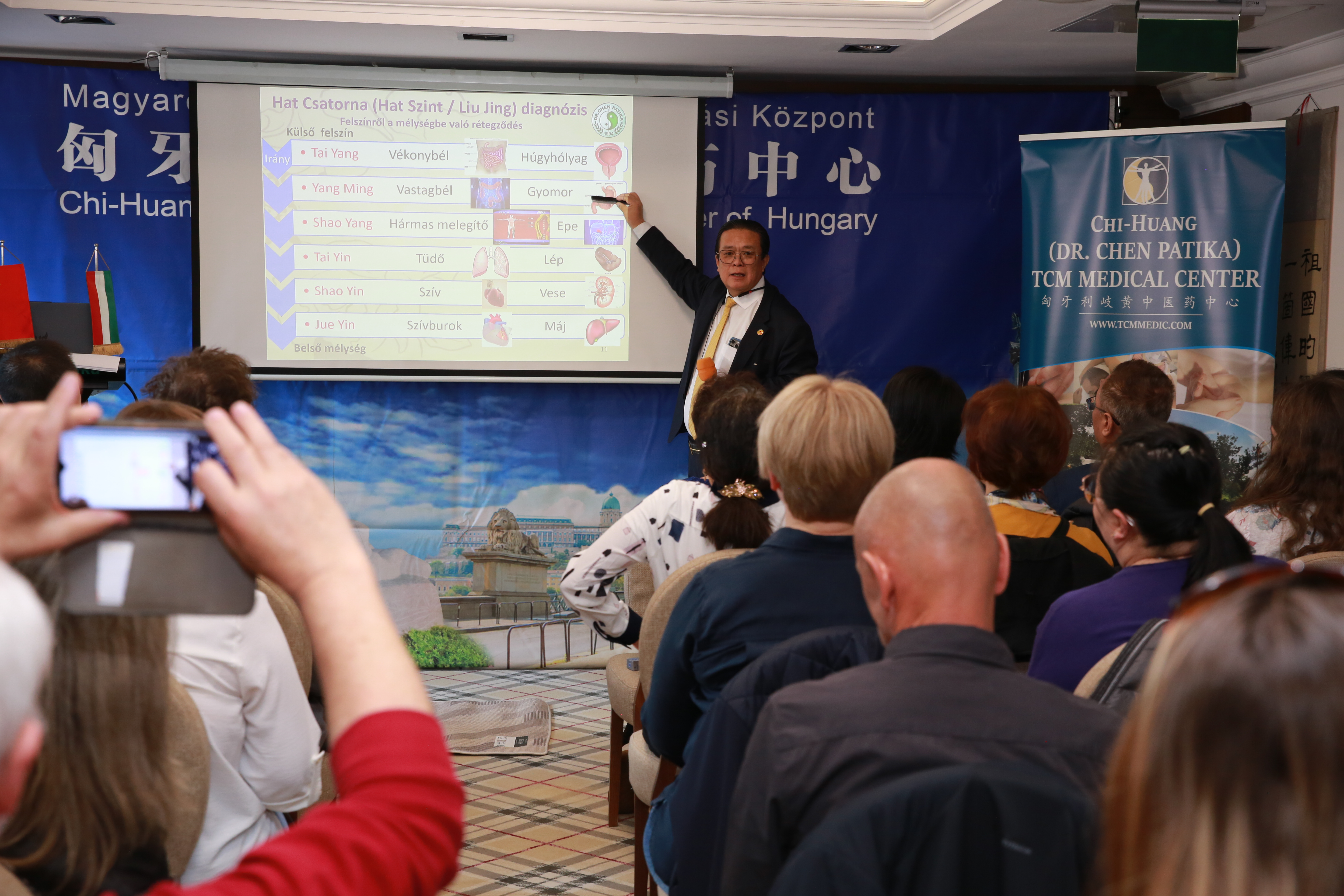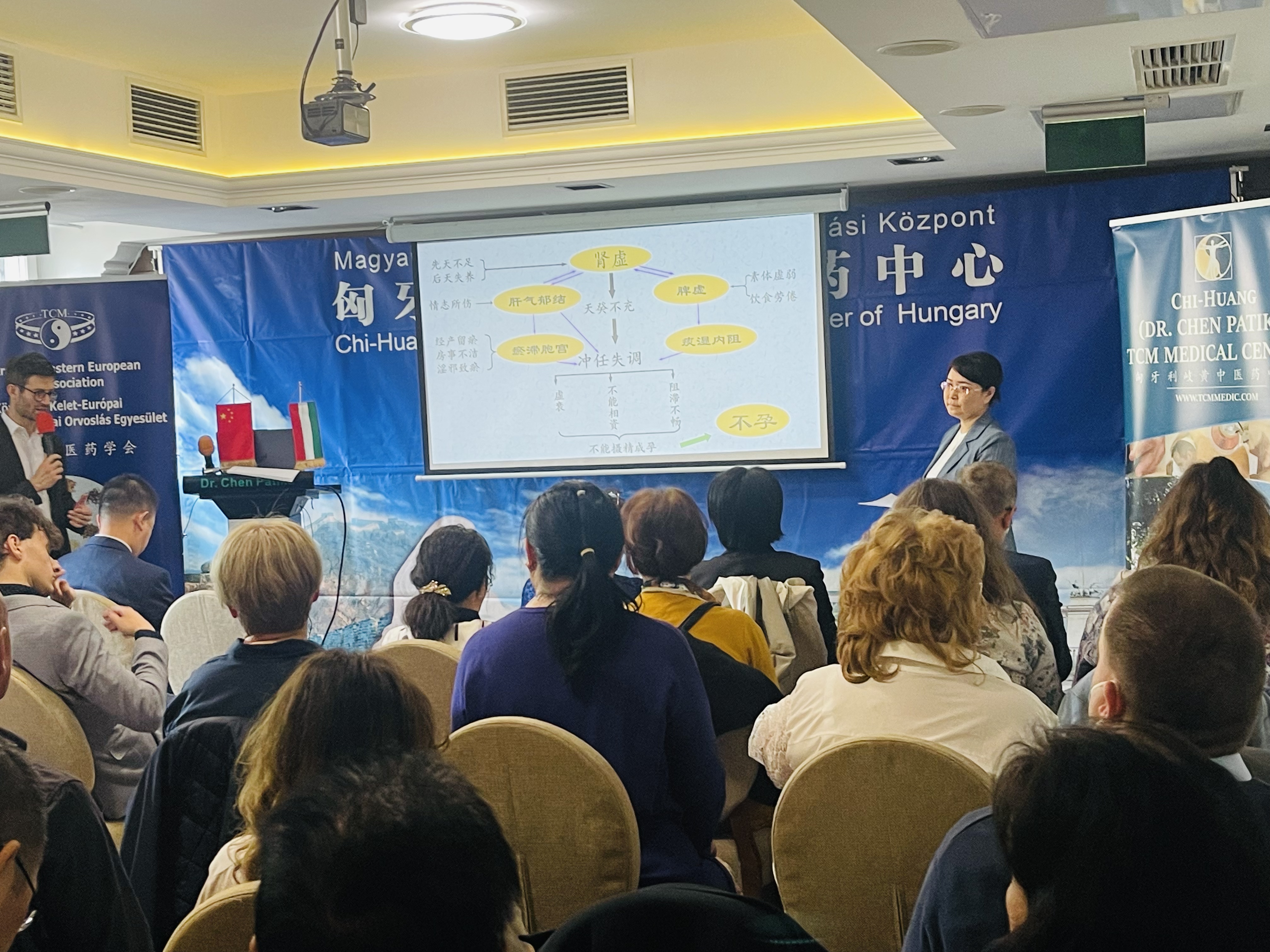 中东欧中医药学会会长,匈牙利多所医科大学客座教授陈震博士做了一小时的匈文演讲,就“六经辩证理论指导下的中医药针灸治疗技巧和临床经验”,全方面展开了针药结合、整体观念、辨证论治的学术思想,“洋中医”们频频举起相机,记录下了珍贵的学术资料。