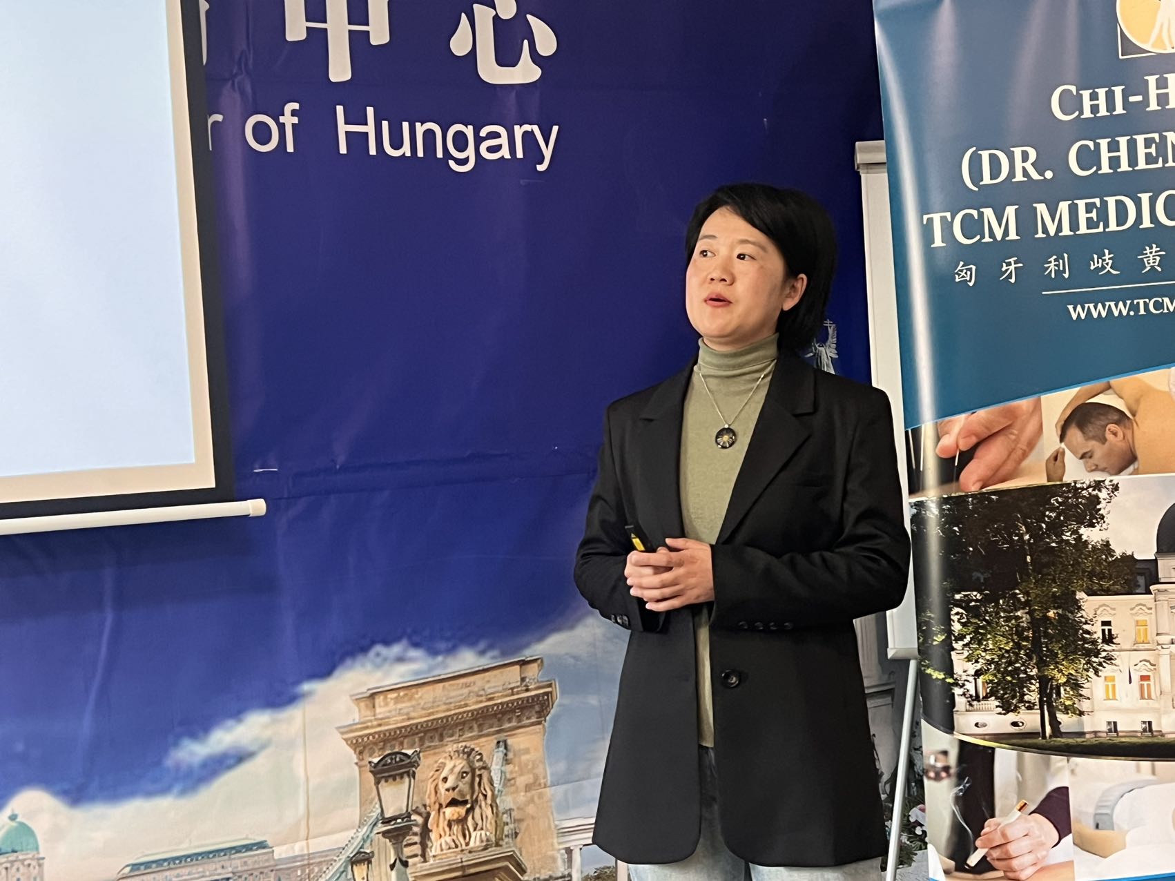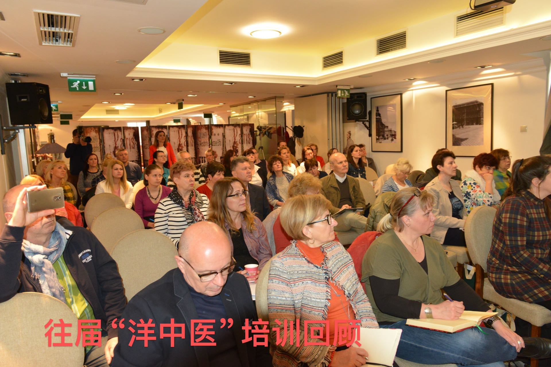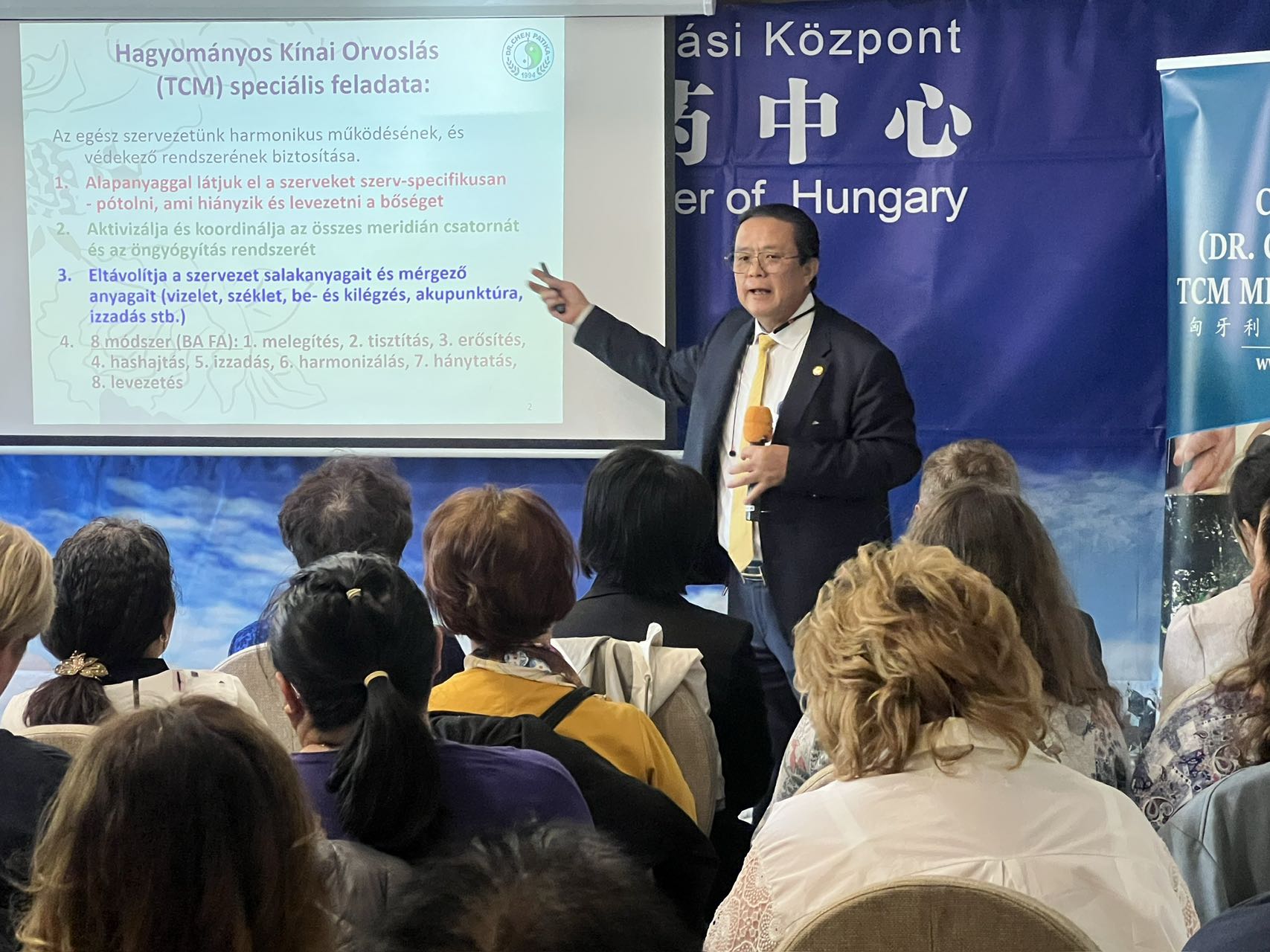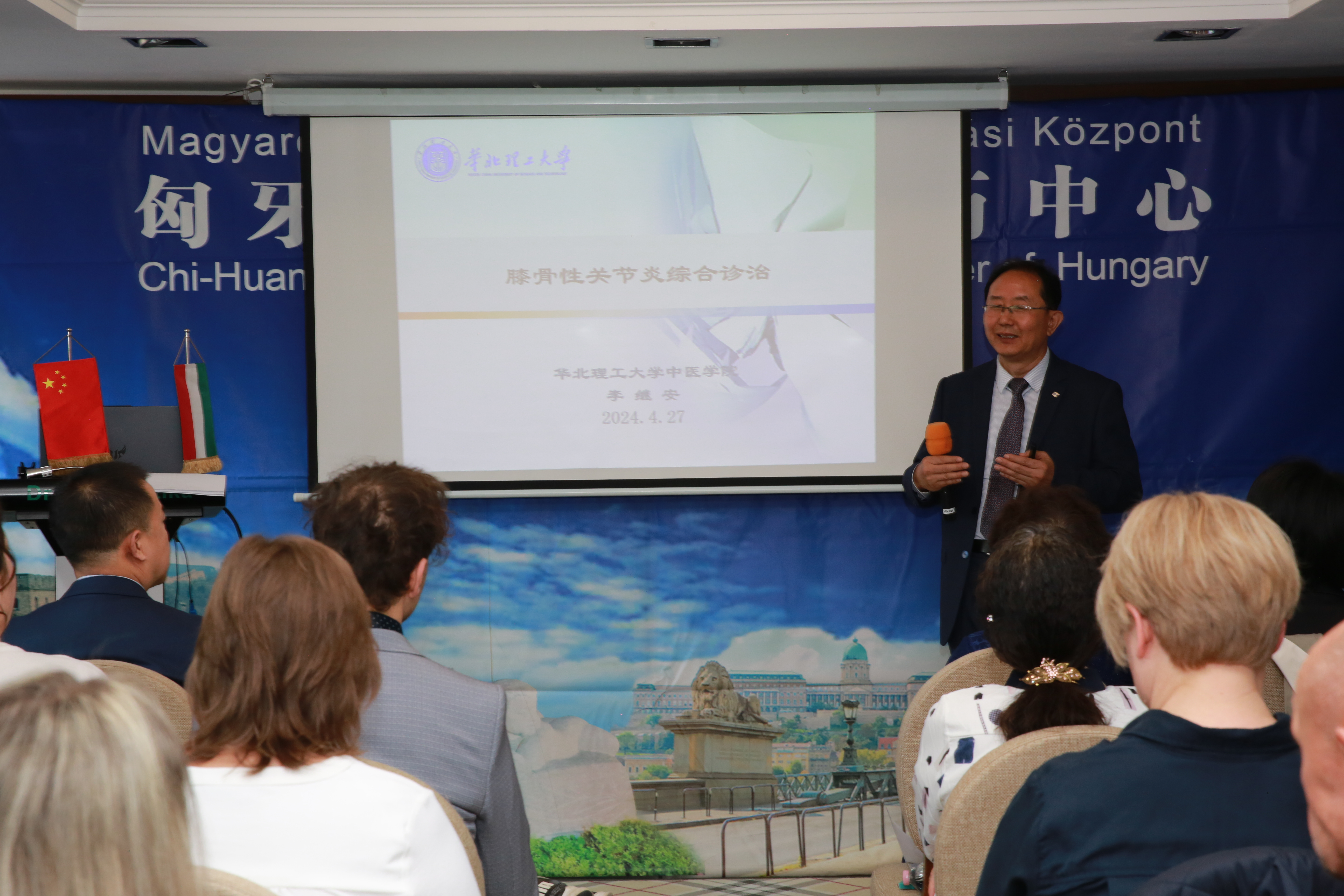 中东欧中医药学会会长,匈牙利多所医科大学客座教授陈震博士做了一小时的匈文演讲,就“六经辩证理论指导下的中医药针灸治疗技巧和临床经验”,全方面展开了针药结合、整体观念、辨证论治的学术思想,“洋中医”们频频举起相机,记录下了珍贵的学术资料。