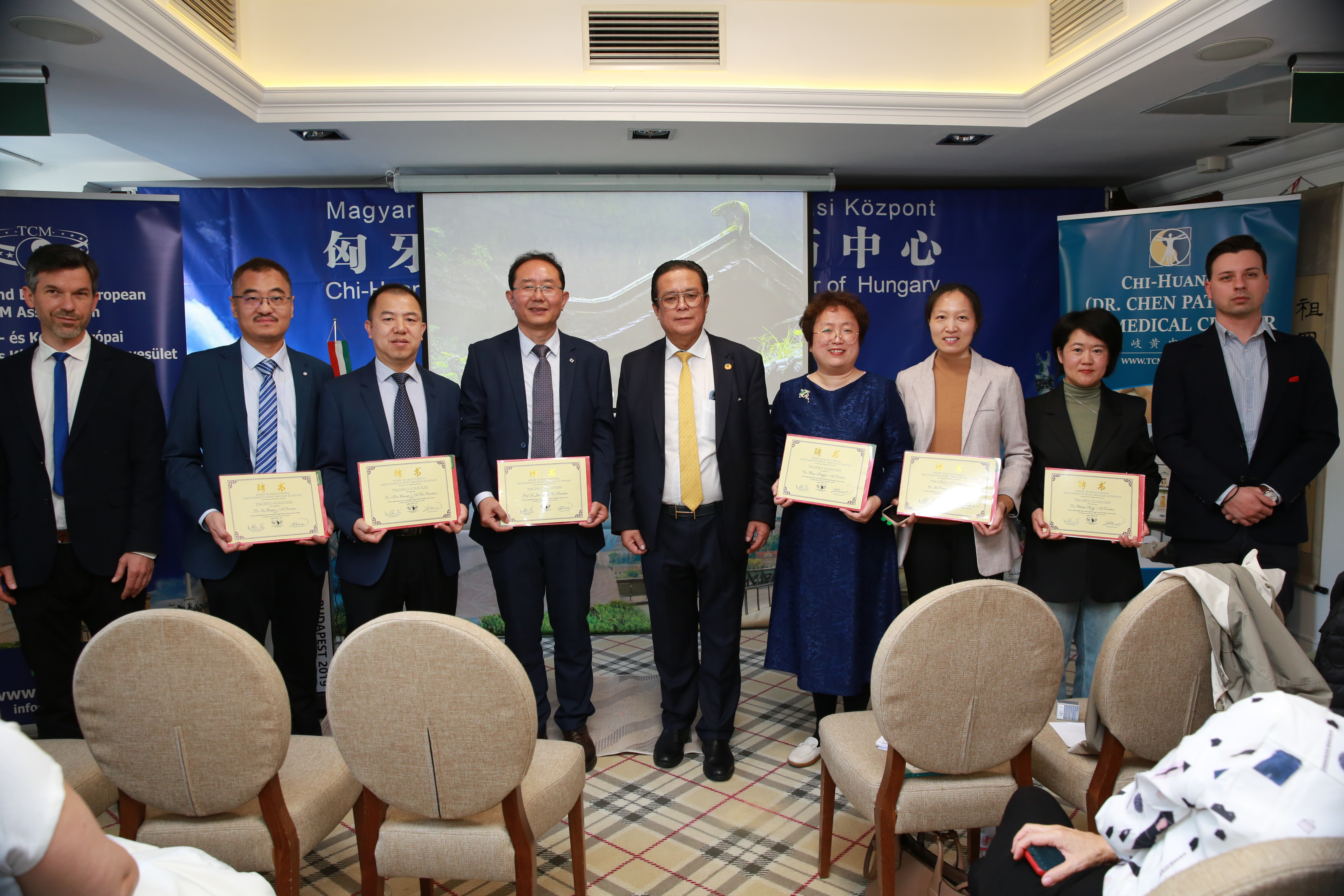 向新任的中东欧中医药学会副会长和常务理事颁发证书。