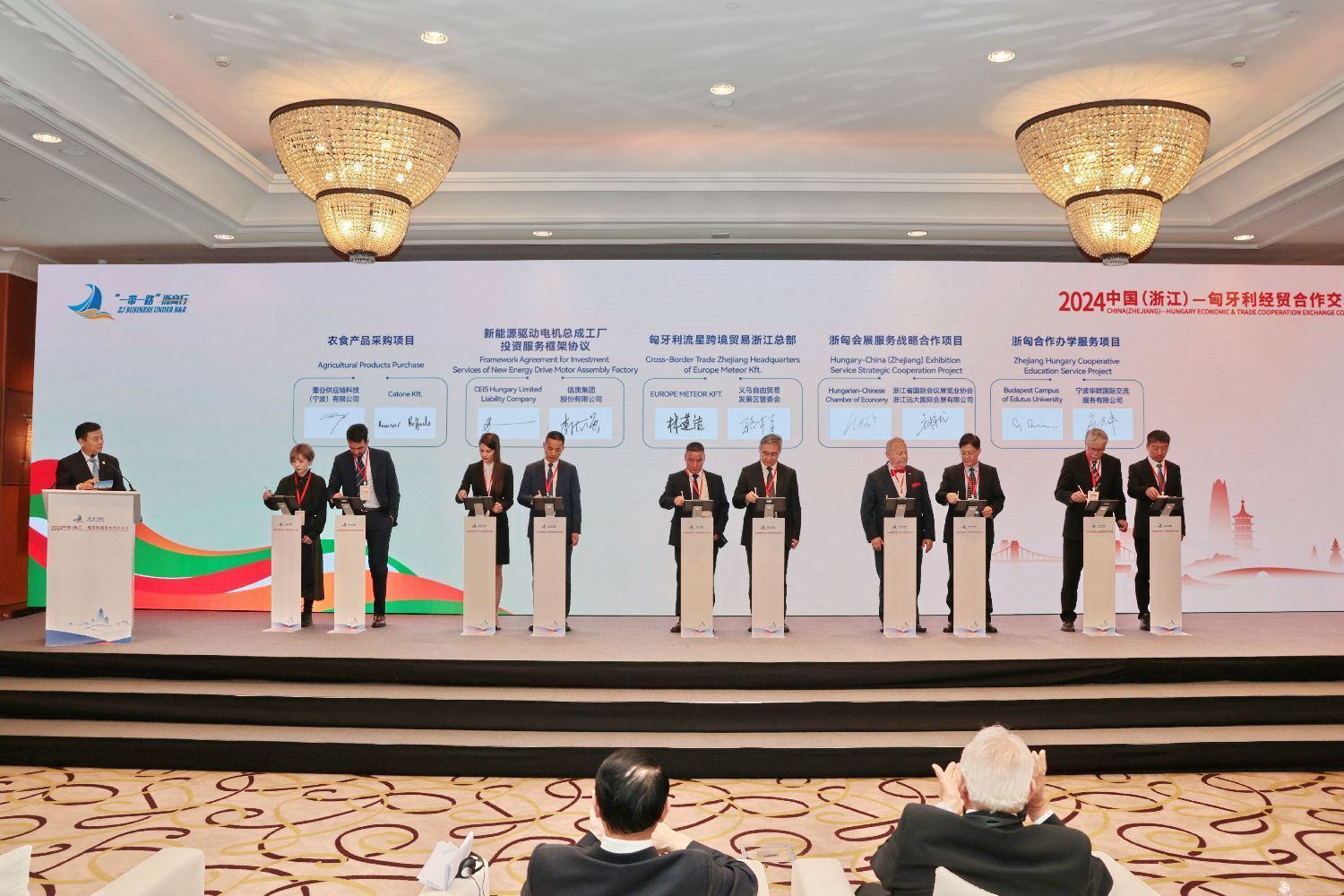 合作交流会上,省商务厅、宁波市负责人分别作浙江省投资贸易环境、宁波市投资贸易环境及中东欧合作情况推介,匈牙利出口促进署负责人介绍匈中贸易情况。此次,浙江与匈牙利共签约投资贸易合作项目23个,涉及投资建设、商品采购、金融服务、航空物流、教育科技、影视文化交流、会展服务等类别,总金额6.5亿美元,其中现场签约项目20个。