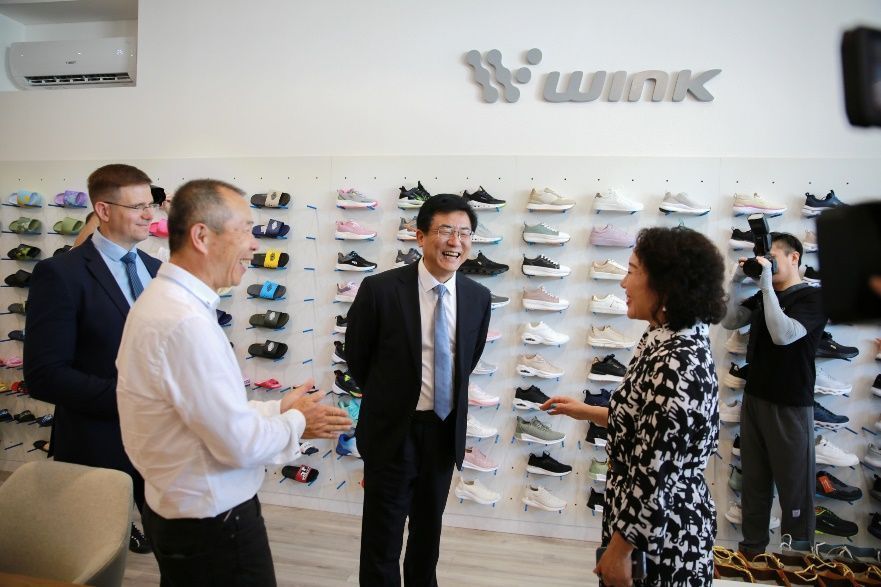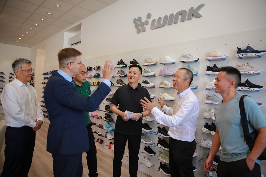 安踏集团联席CEO吴永华(右三)同时到访威克总部,并与魏翔先生及威克集团副CEO米贺兹·约瑟夫详细沟通运动鞋的材料与技术事宜。