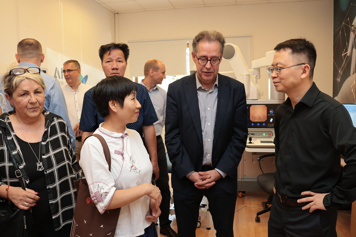 安翰科技(武汉)股份有限公司创始人兼首席执行官肖国华(中右)、Endorobotics肠胃病医疗中心创办人之一马达奇·拉斯洛教授(中左)剪彩。