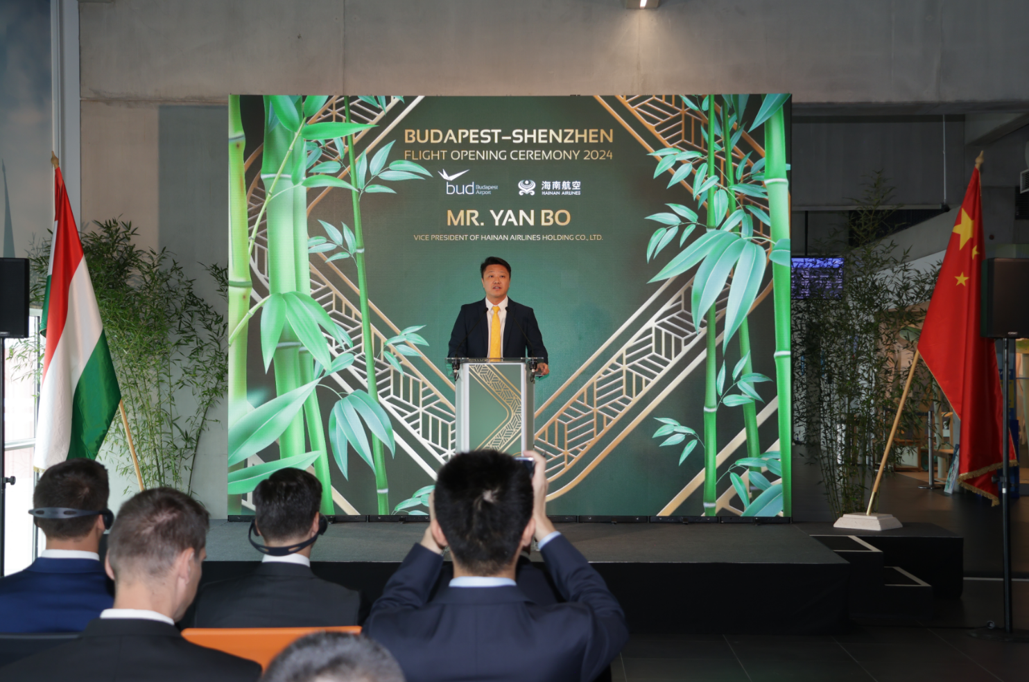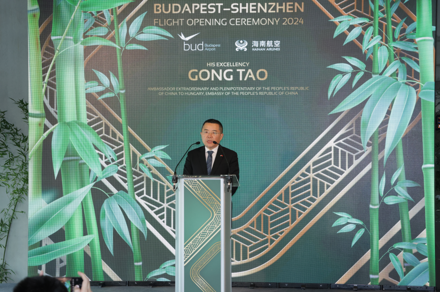 中国驻匈牙利大使馆龚韬先生在致辞中祝贺海南航空布达佩斯—深圳航线顺利开通,他提到:“当前,中匈关系迎来新的发展机遇。双方将聚焦高质量共建“一带一路”,秉持共商共建共享原则,深化战略互信,加强务实合作,促进民心相通,开辟双边关系新篇章。”