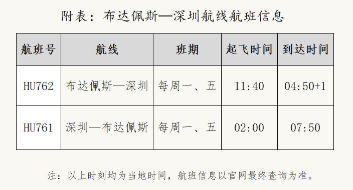 海南航空布达佩斯—深圳往返国际航线计划每周执行两个往返航班,班期为每周一、五。去程航班HU762计划当地时间11:40从布达佩斯李斯特·费伦茨国际机场起飞,北京时间次日04:50到达深圳宝安国际机场;返程航班HU761计划北京时间02:00从深圳宝安国际机场起飞,当地时间07:50抵达布达佩斯李斯特·费伦茨国际机场,以上航班信息均以实际查询为准。