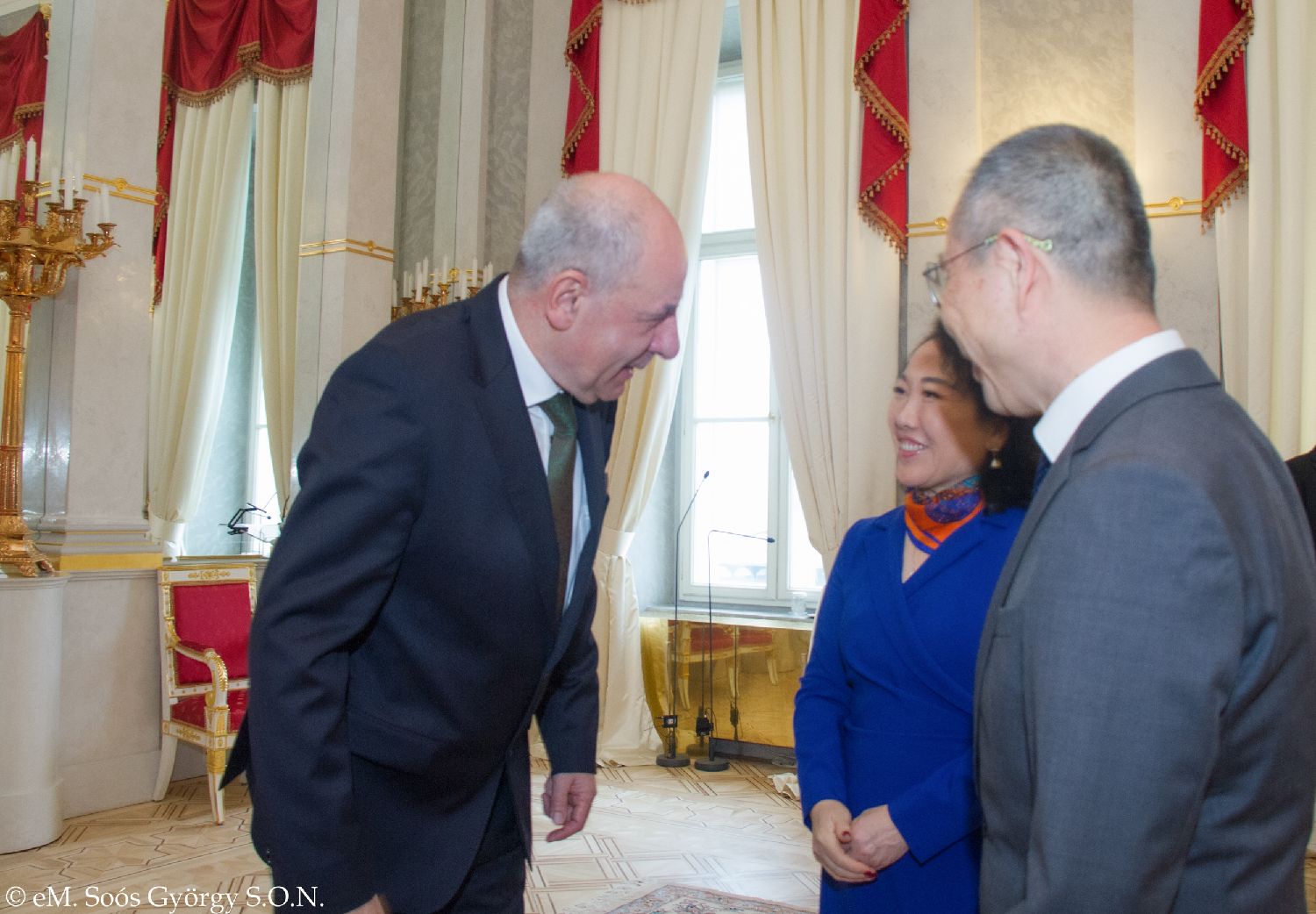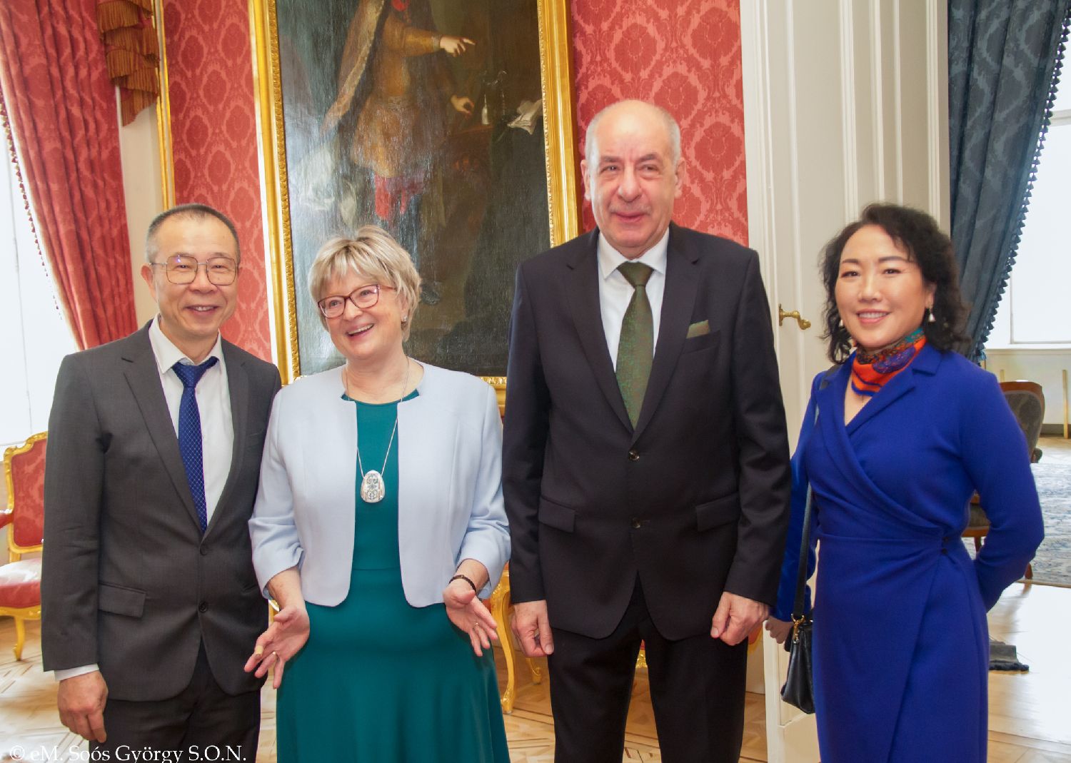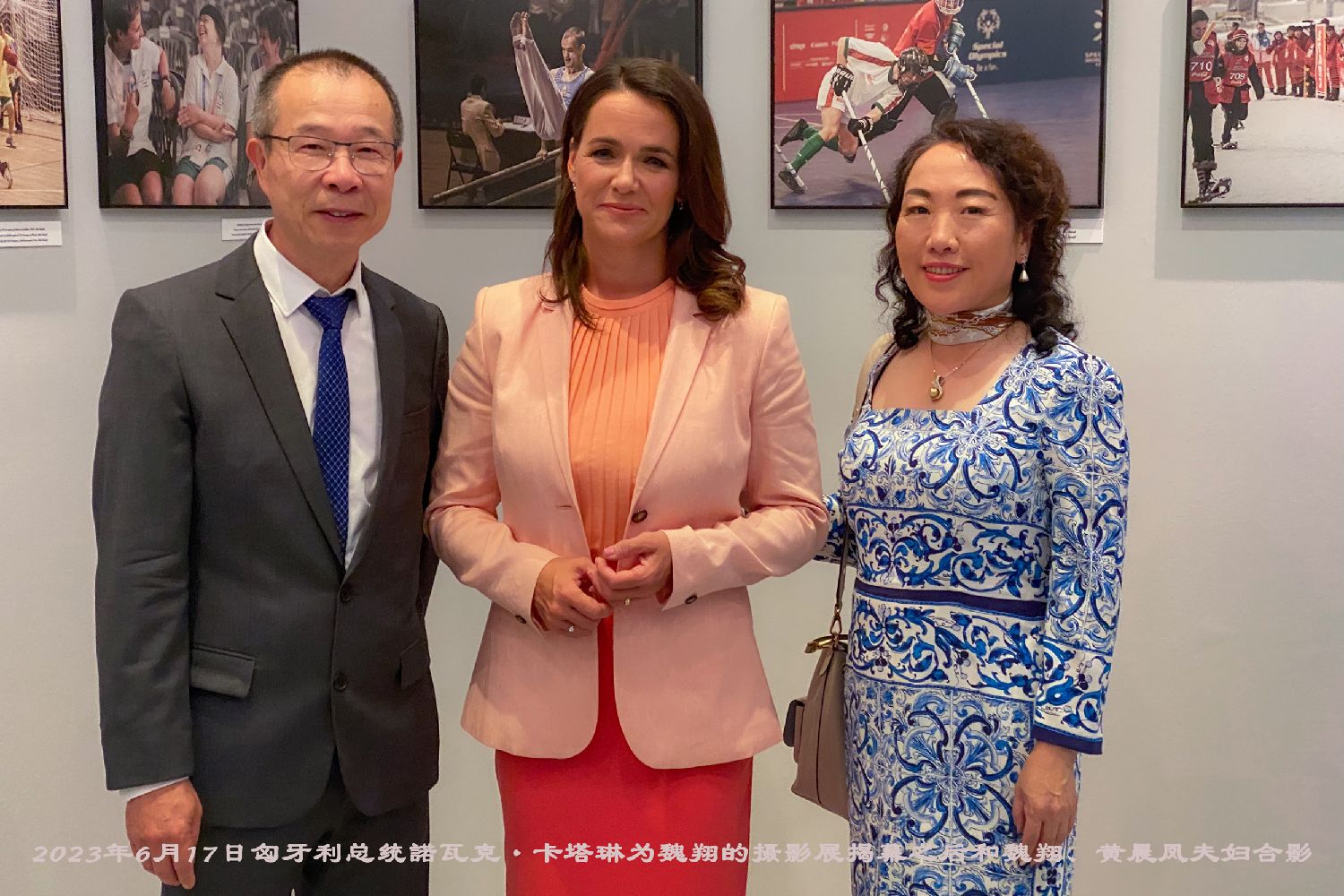 2023年6月17日匈牙利总统诺瓦克·卡塔琳为魏翔的摄影展揭幕之后和魏翔、黄晨凤夫妇合影。