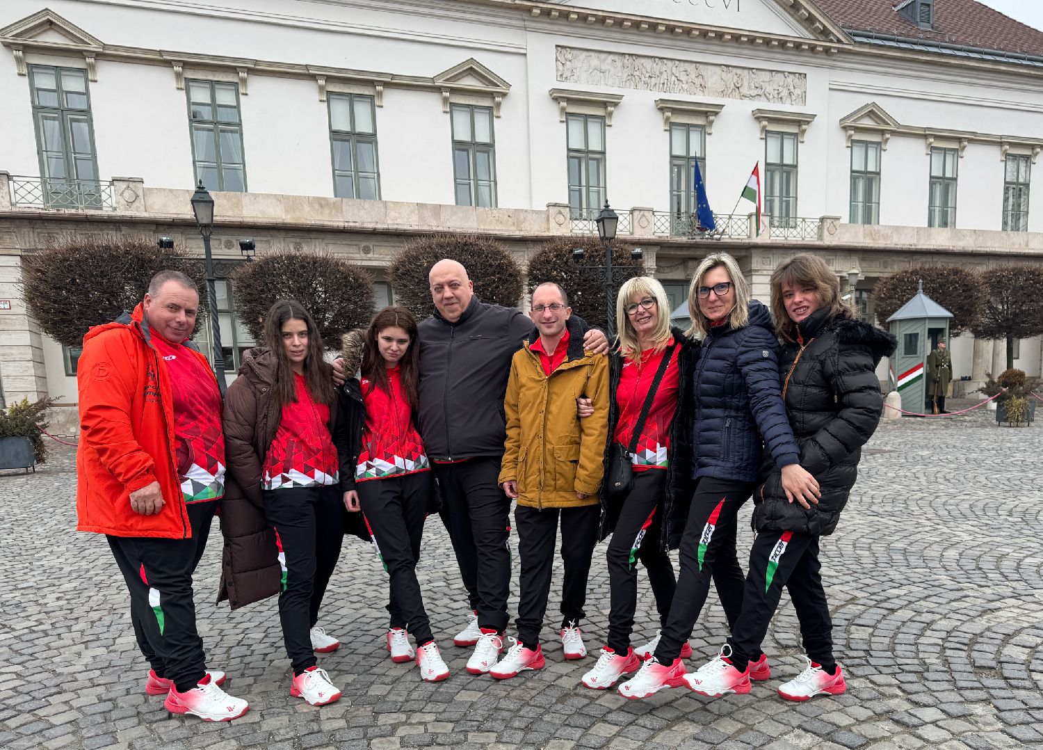 匈牙利特奥运动员穿着威克(Wink)鞋在总统府门前。