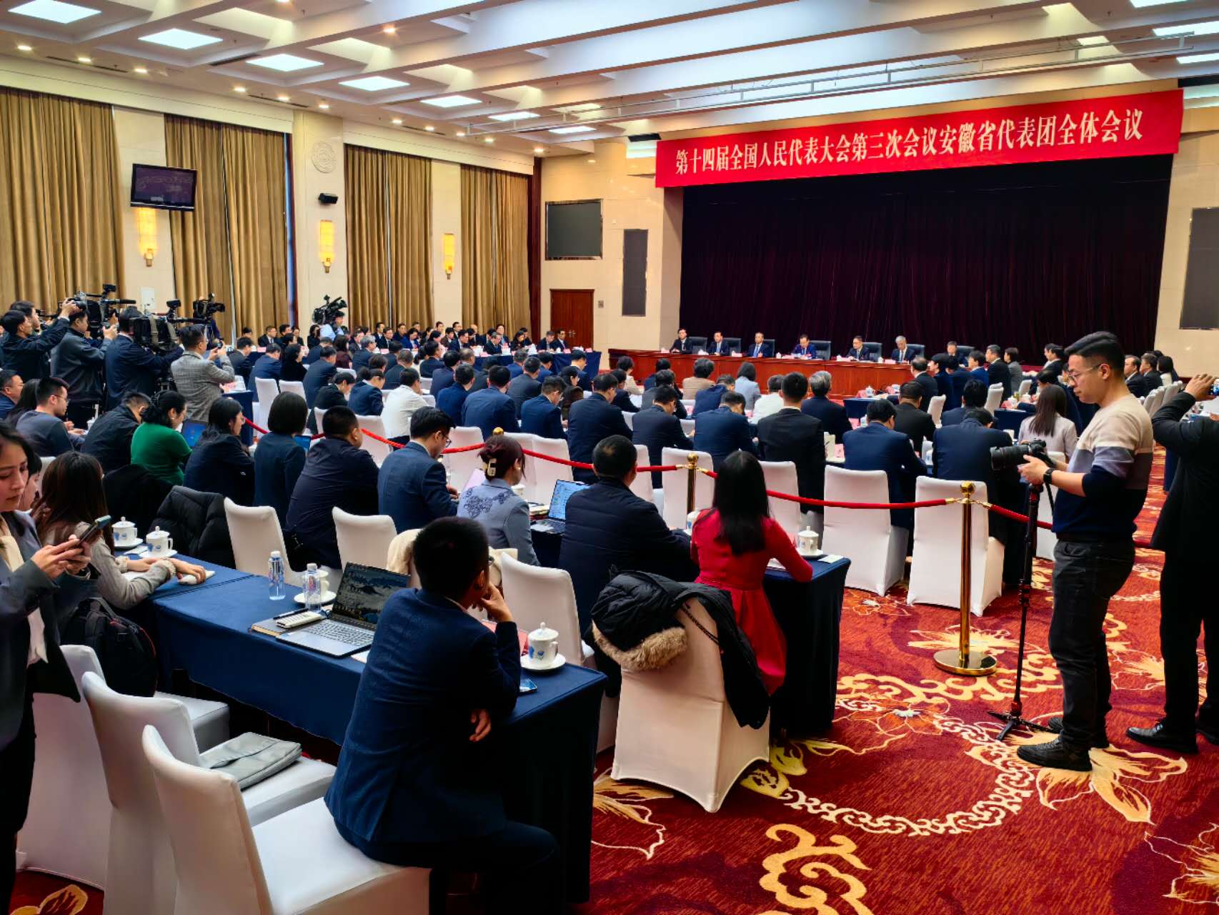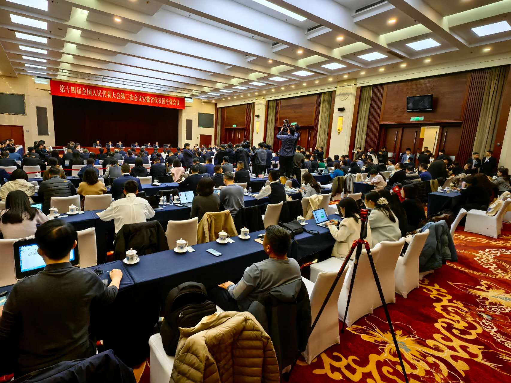 安徽代表团住地会议厅里座无虚席,来自人民日报、新华社、中央广播电视总台、光明日报、中国日报、中国新闻社、香港大公文汇报、法国欧洲时报、匈牙利新导报、韩国中央日报等70家境内外媒体、108名记者到会旁听与采访。