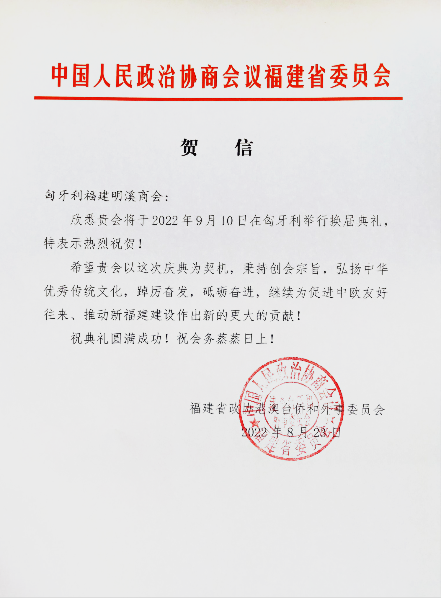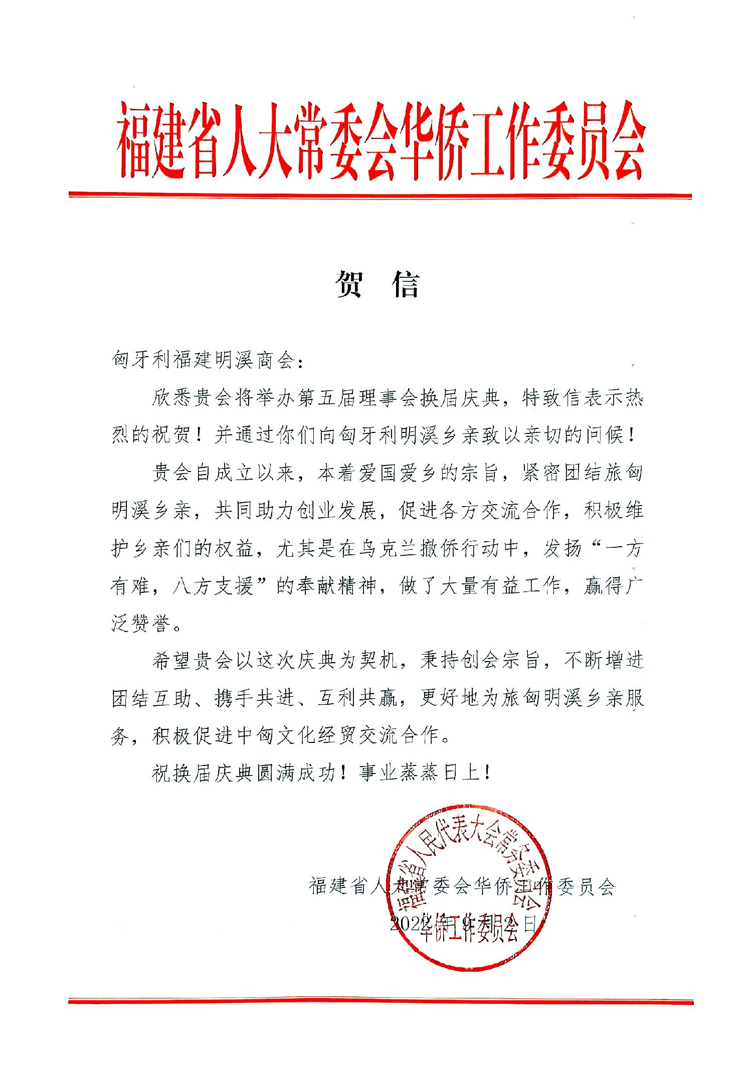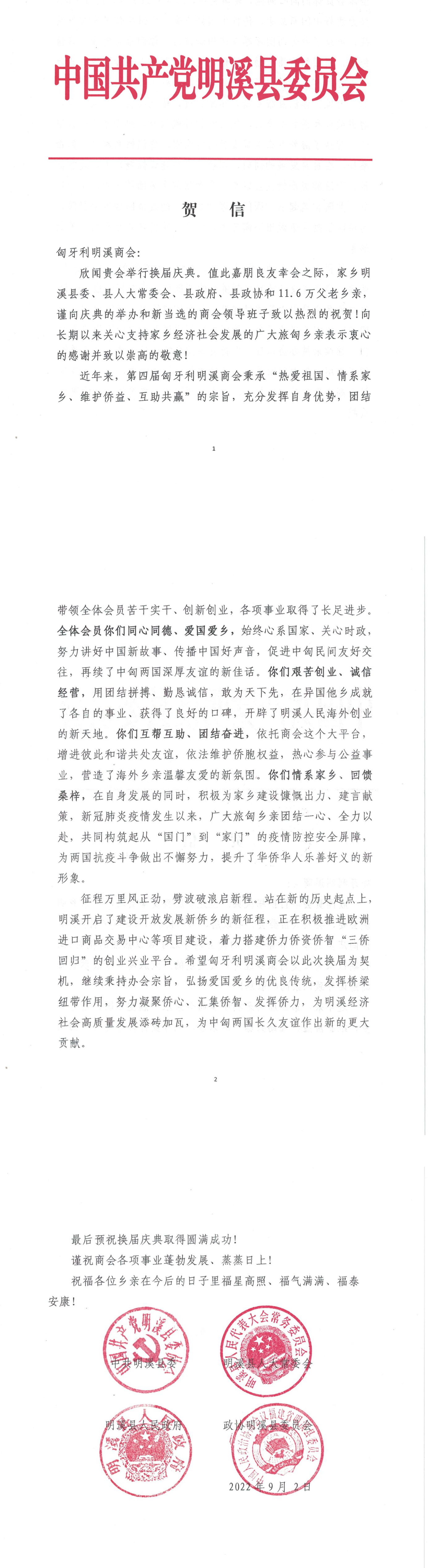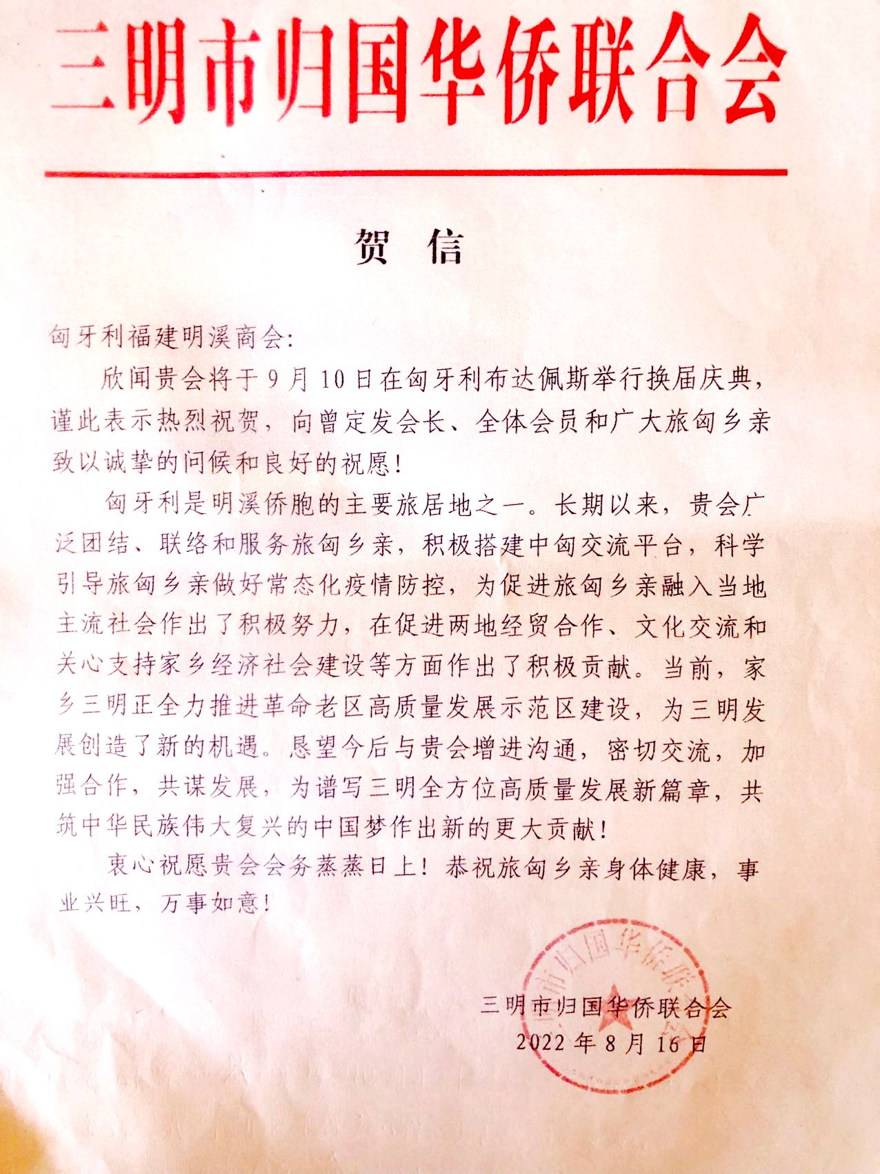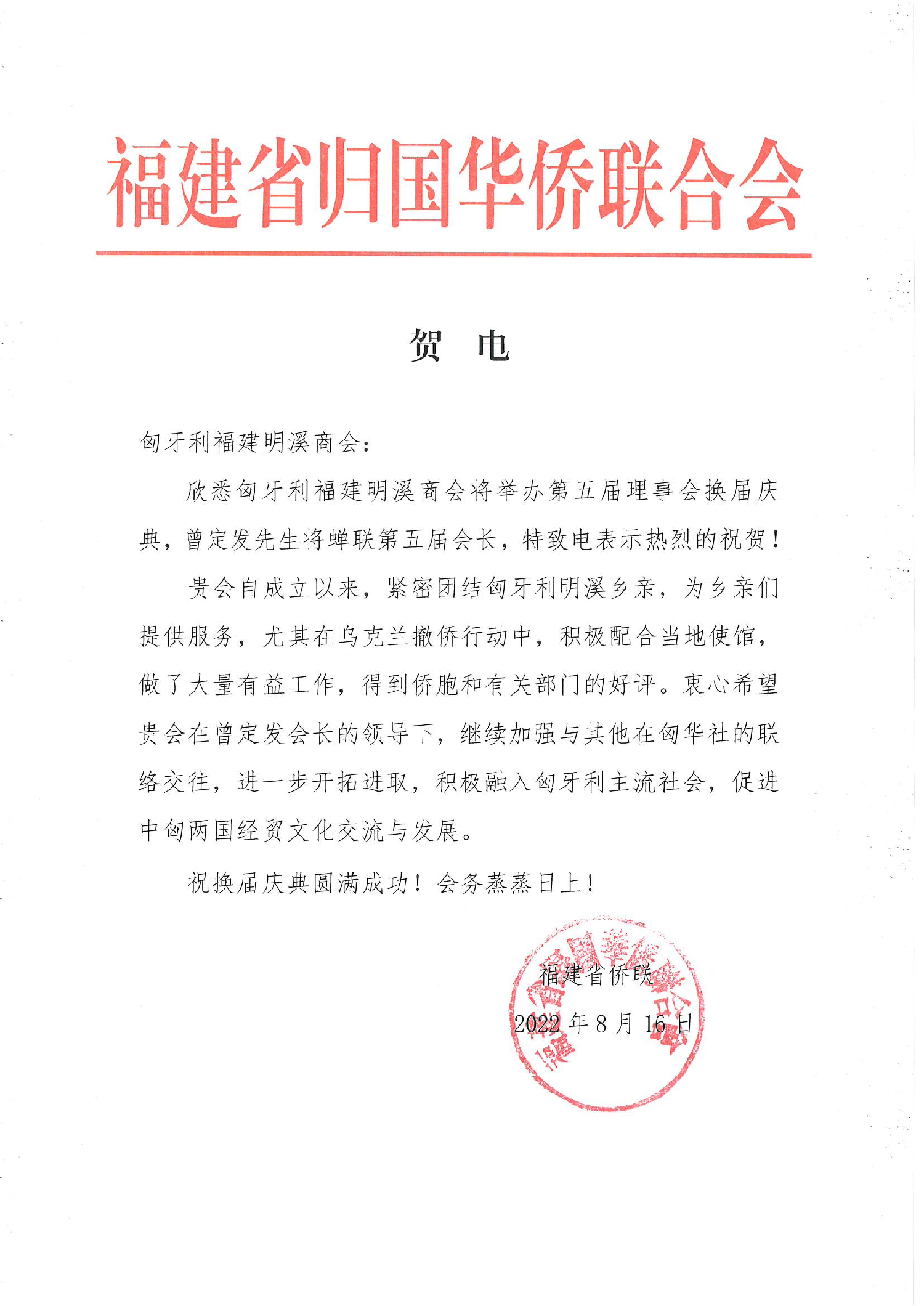 匈牙利明溪商会换届的信息发布以来,陆续收到了来自祖国省、市、县和当地匈牙利及欧洲各兄弟社团发来的数十份贺电、贺信。匈牙利明溪会常务副会长潘惠清宣读了福建省人大华侨委、福建省政协、福建省侨联、三明市侨联和中共明溪县委、明溪县人大常委会、明溪县人民政府、政协明溪县委员会的贺电。