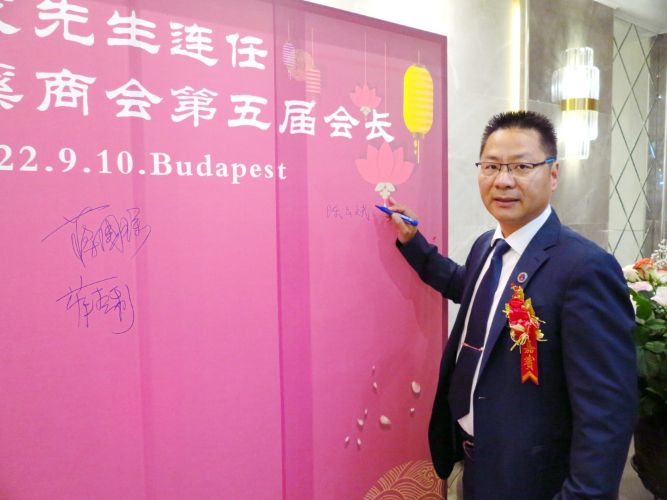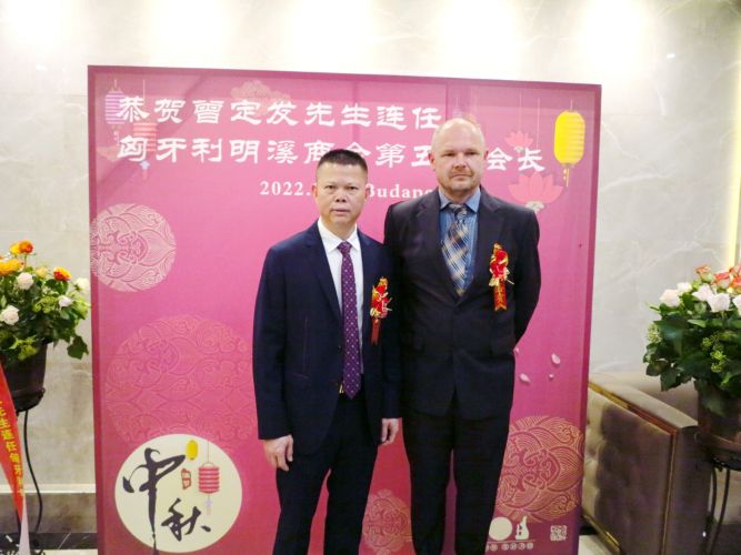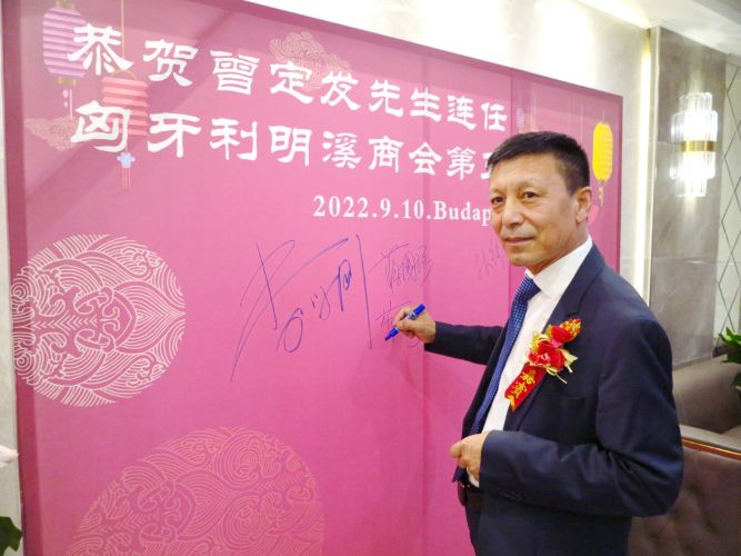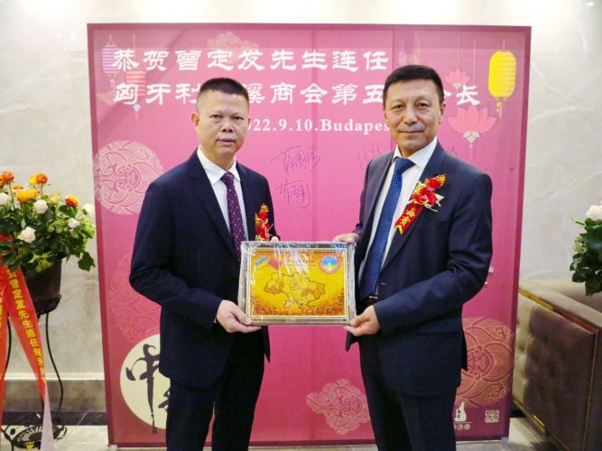 “说到俄乌战争爆发的撤侨事件,我也要介绍一下欧福联所做的工作。欧福联在福建省侨联的指导下,第一时间发出告知函,我们的侨团协助各地大使馆有序地撤侨。撤侨成功后,在五月份,为这次撤侨活动做出贡献的部分侨团举行叙乡情、聚侨心的乌克兰撤侨座谈会。活动圆满成功。在此我要向明溪商会再次表示感谢。德国福建商会与匈牙利明溪商会成为长久的兄弟互助社团,让我们为广大在欧侨胞的幸福生活做出贡献,共同开启欧洲侨社发展新篇章。同时也让我们携手为祖国伟大复兴的“中国梦”添砖加瓦。最后祝愿曾定发会长带领匈牙利明溪商会的全体成员同心同德、携手并进、创正守业、商会发展再上新台阶!今天也是中秋节,同时我也祝在座的各位朋友身体健康、万事如意、阖家幸福!”
