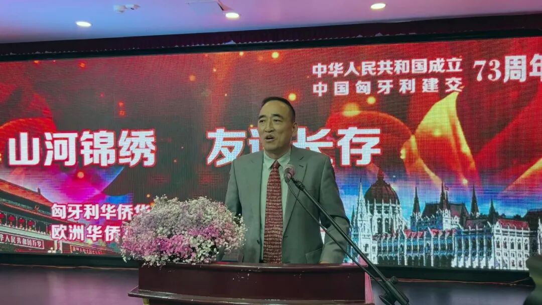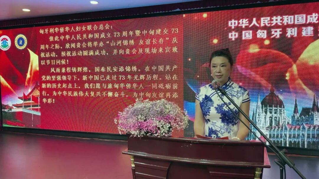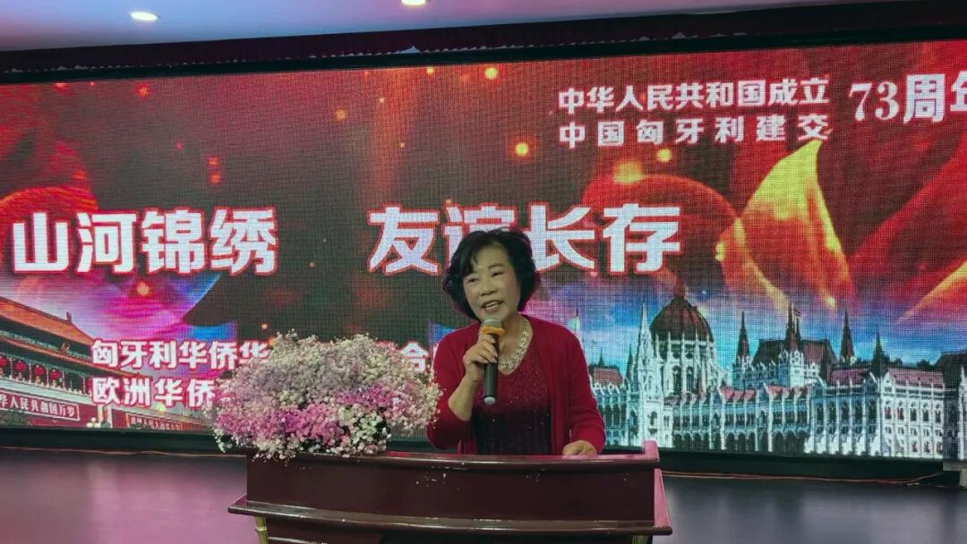 林胜琴会长说:“73年来,我们的祖国摆脱了积贫积弱任人宰割的悲惨局面,走上了民族复兴的大道,综合实力日益壮大,科技发展日新月异,全面建成了小康社会,取得了令世人瞩成就,我们海外华人为之感到无比的骄傲和自豪。长期以来,中国驻匈牙利大使馆对我们华人的工作生活和社团建设给予了高度关注和关怀。在新冠肺炎疫情期间全力以赴,为指导我们抗疫付出了艰苦的努力,我们一定不忘领导的关心与嘱托,努力把侨团建设做得更好。“73年来,中匈两国的友谊由浅入深,取得了全面发展。两国人民相互信任、相互支持,在不同的领域开花结果,旅居匈牙利的华人,深感在这里如同在家一样。长期以来,匈牙利友人对待我们像亲人一样温暖,十区的领导给我们提供了非常多的便利和关怀,经常亲历现场指导工作,无论在工作、生活上遇到什么样的困难,总会及时向我们伸出援手,帮助我们解决问题,大家建立了广泛而深厚的感情,实现了友好合作,相互成就,共同进步。“华夏文化源远流行,匈牙利文化同样享誉世界,这里有英雄史诗,在欧洲近代史上影响深远。在两国文化交流中,孔子学院发挥了独特的重要作用,人文交流不断拓展。李院长自赴任以来,非常关心旅匈社团的文化建设,对社团活动提出了宝贵的指导意见,让我们受益匪浅。我们要对长期以来支持华人商业发展、社团建设的匈牙利友人、孔子学院的领导师生再一次表示感谢。“匈牙利是中国倡议的‘一带一路’上的重要国家,中匈两国有着同样的发展理念,在经贸文化方面拥有广泛的合作基础,这给我们提供了更多的契机。我们热诚地期望与匈牙利友人一起,把握大势,聚焦合作,为中匈两国的友谊再做新的贡献。祝愿伟大的祖国欣欣向荣,坚实前进,祝愿我们的友谊万古常青,共同创造更加美好的未来。”