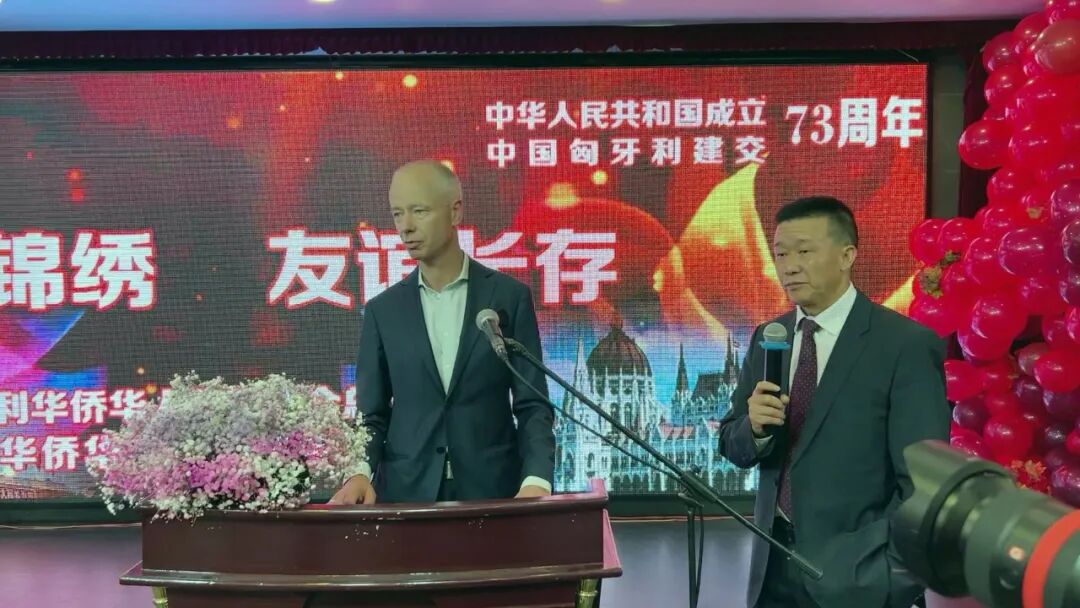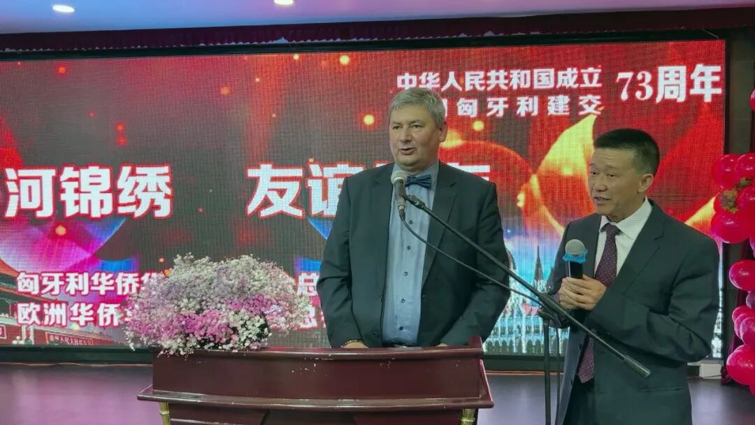 匈牙利总理府国务秘书首席顾问森特什·陶马什博士致词首先祝贺中华人民共和国成立73周年。他说,经过73年的发展,中国已日益强大,包括广大匈牙利人民在内有目共睹。匈牙利体制变革32年,只有近年来的向东开放政策实施以来才有了真正的发展。我们希望匈牙利能像中国一样能够走可持续发展的道路,我们坚信匈牙利跟中国之间友谊会更加牢固。祝贺中国取得伟大的发展变化,祝愿在匈牙利生活的中国朋友取得更大的成绩。