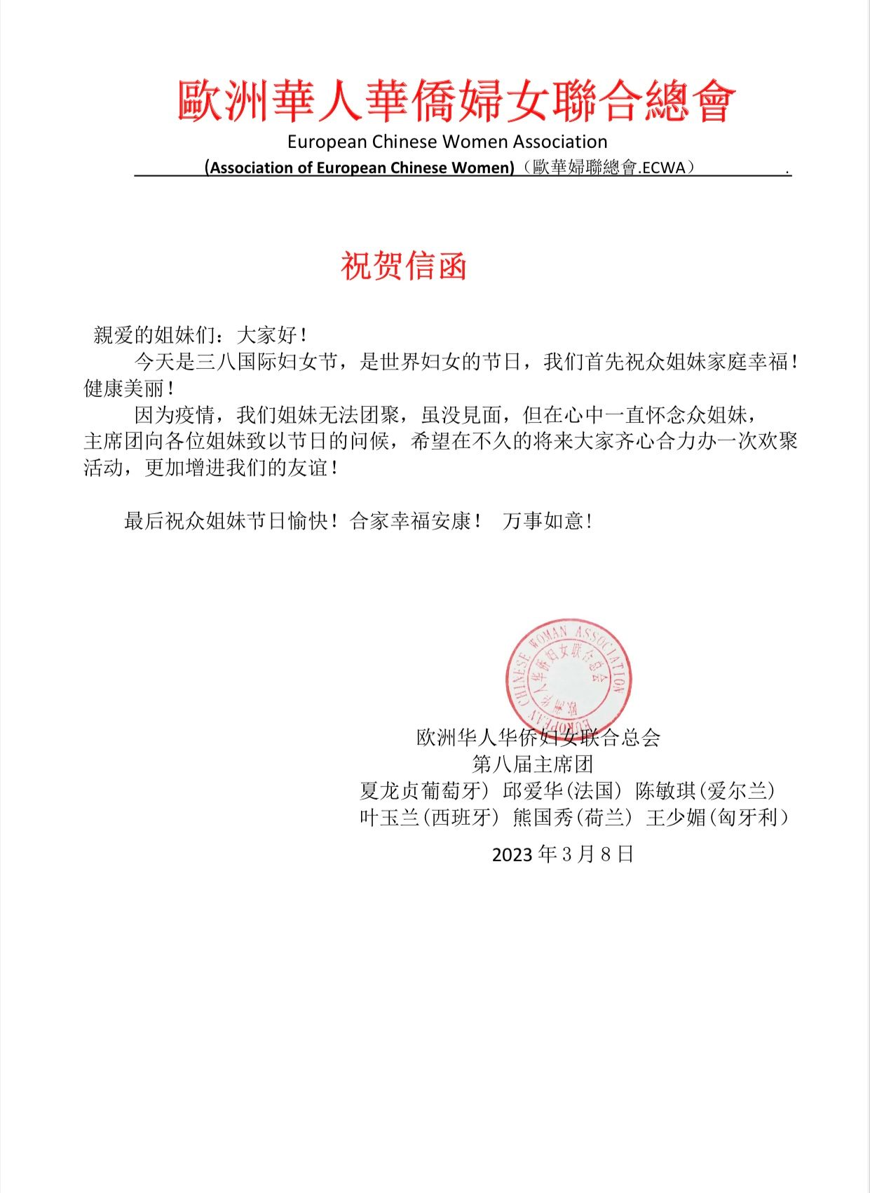 生活因为有了女性而馨香温情,世界因为有了女性而绚丽多彩,侨团有了女性才更加丰富与和谐。我们妇联里姐妹们大多数都是女强人和企业家,从事外贸进出口商品工作,从事商店零售生意,在这几年我们都经历了新冠疫情+俄乌战争、能源短缺+通货膨胀、货币貶值+成本提高,种种困难围绕着,但是姐妹们克服种种困难昂首向前,只有顺应市场变化,才能立足,不被淘汰,疫情后三年,你要么出众,要么出局,没有中间选项。我们要做的,是顺应时代,是破解困局,也是自我更新。做一个时时精进自己的人,才能无惧时代洪流。做新时代有文化有梦想的女性。让我们怀揣着青春激昂的朝气,在这片广袤的蓝天下,放飞自己的希望,发扬女性风采,希望我们都在各自的生活领域中发展的越来越好。