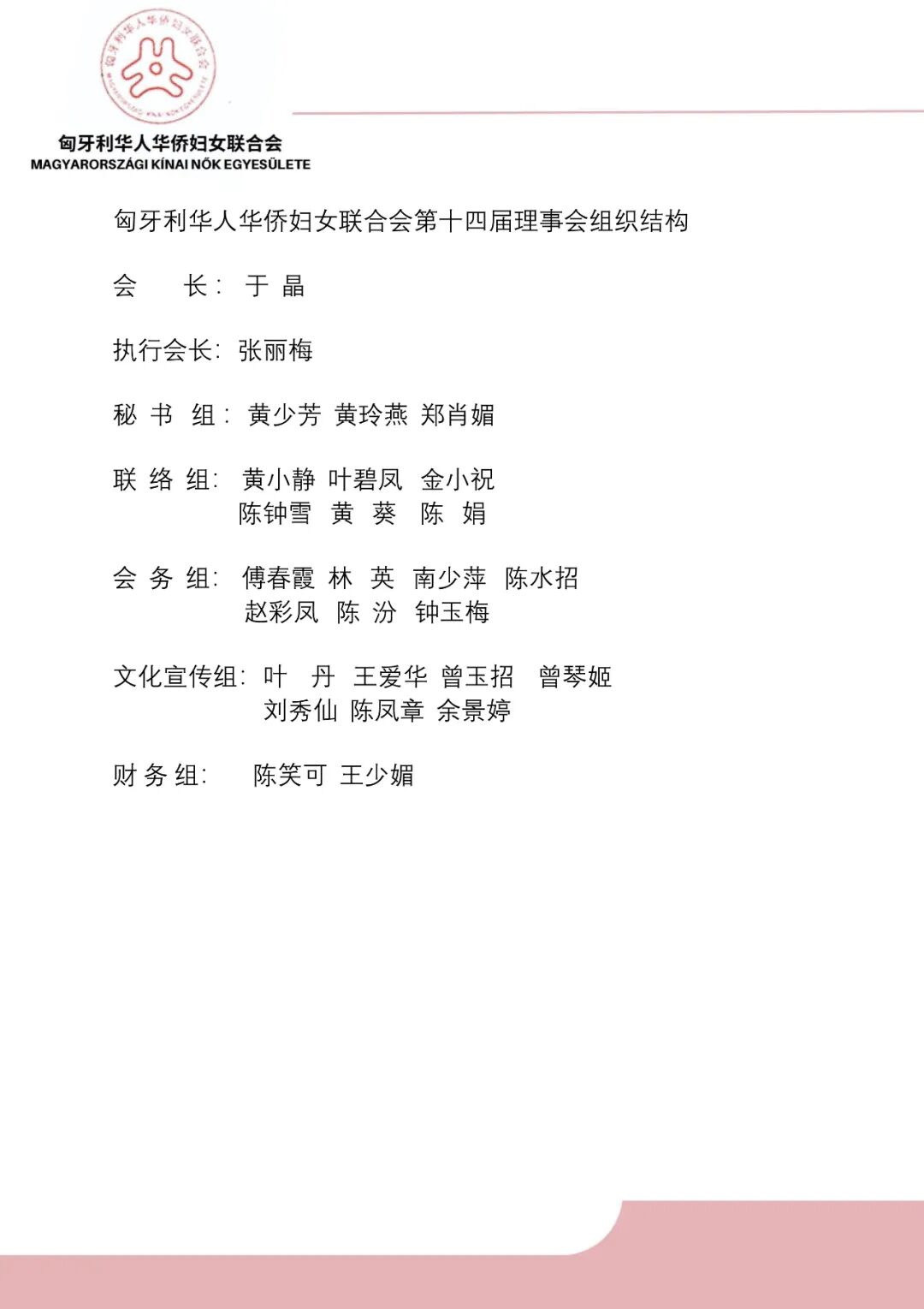 匈牙利华人华侨妇女联合会第十四届理事会组织结构