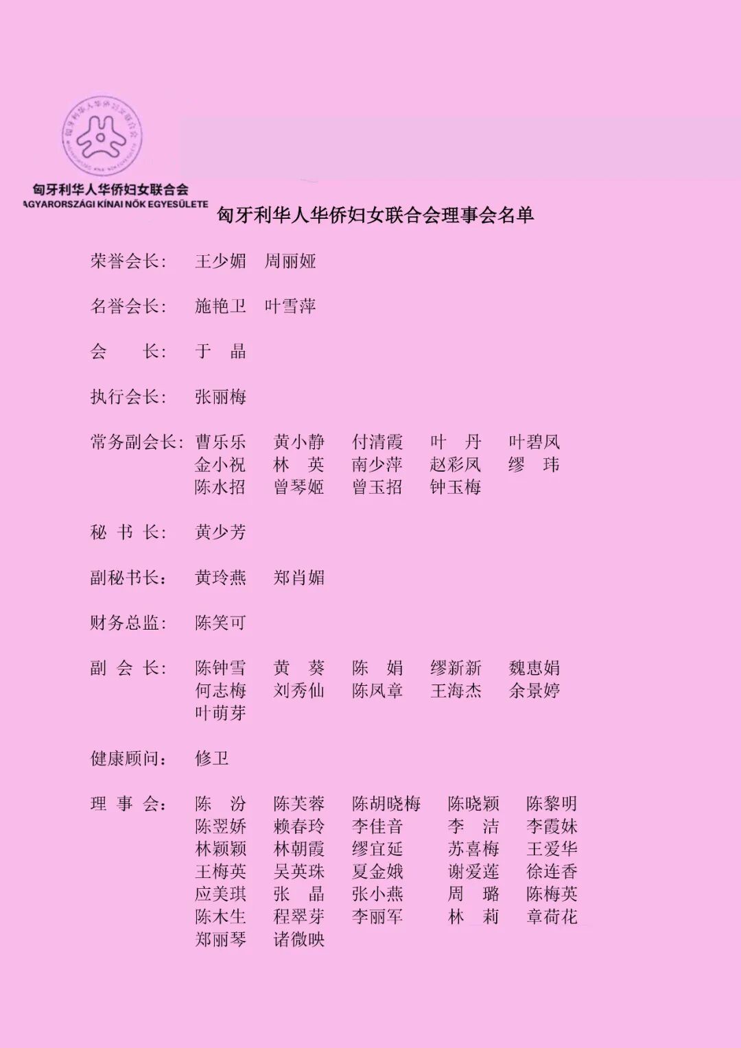 第十四届匈牙利华人华侨妇女联合会理事会名单