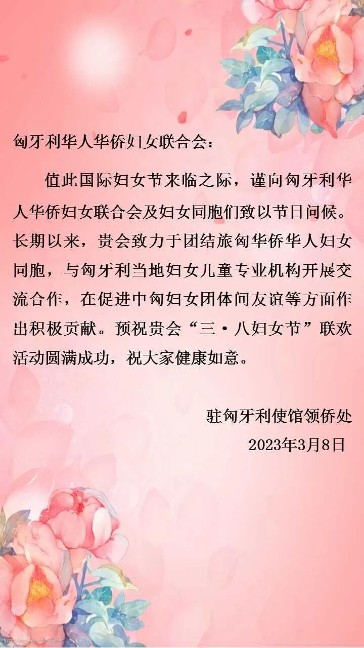 大地回春三月八,红妆素裹满园花。2023年3月8日晚上匈牙利华人华侨妇女联合会在布达佩斯九龙饭店举行庆祝三八国际妇女节庆祝活动,匈牙利妇女联盟组织代表、匈牙利妇女儿童健康协会代表、匈牙利VELENCE市市长、匈牙利龙舟协会会长、匈牙利侨界社团代表、华人华侨代表、妇女联合会姐妹们等等100多人参加。在鲜花、歌声、祝福和美酒交映里,致敬女性,盘点成就,向女士们祝福节日。