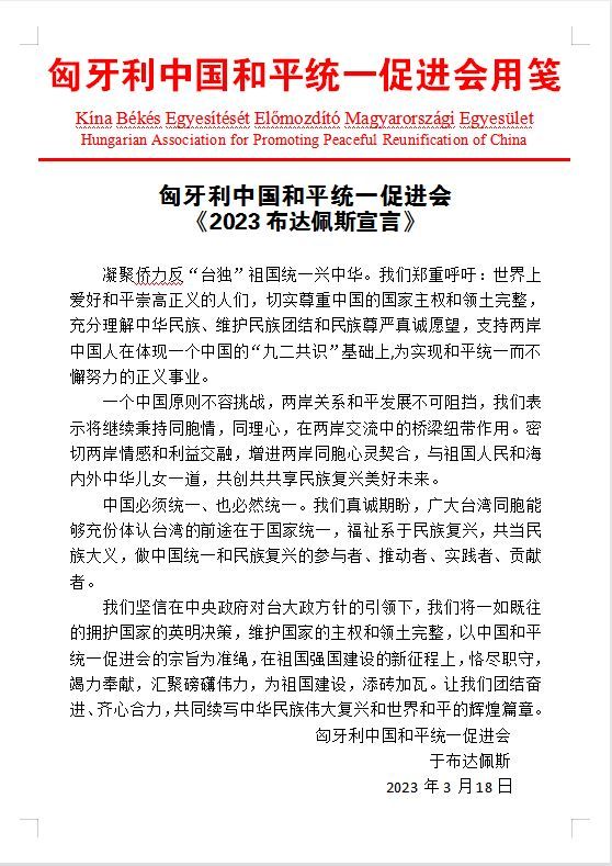 匈牙利中国和平统一促进会《2023布达佩斯宣言》。