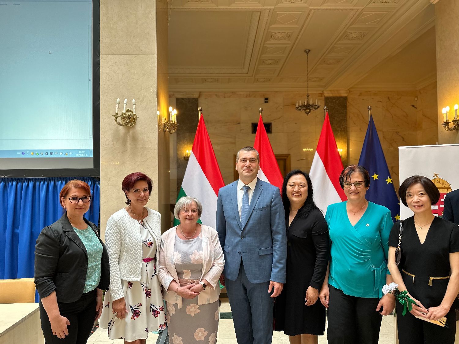 从左至右:匈牙利妇女儿童健康工作者专业协会副会长Tényi Renáta、匈牙利国家医院总局妇女儿童健康者专业部部长曲希·卡塔林(Csősz Katalin)、主席瓦尔法尔维·玛丽安娜(Várfalvi Marianna)、内务部国务秘书米克洛斯·杜凯(Miklós Dukai)、匈牙利华人华侨妇女联合会会长于晶、匈牙利妇女儿童健康工作者专业协会(MVSZSZ)创始人之Lőrinczi Orsolya、匈牙利华人华侨妇女联合会常务副会长黄玲燕女士。