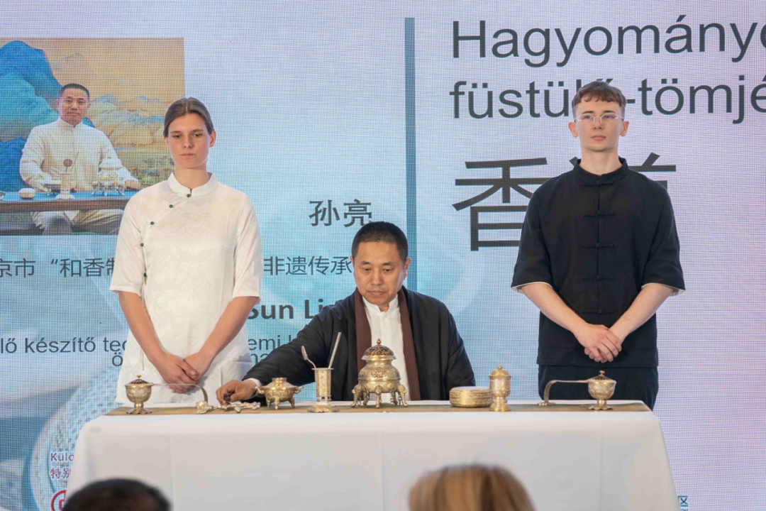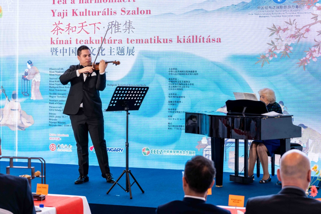 中国民乐古筝演奏过后,匈牙利小提琴家小佐尔坦·马加(Mága Zoltán Jr)为来宾带来了意境优美的《茉莉花》。“论茶”环节由匈牙利帕兹玛尼彼得天主教大学中文系主任绍莱特博士(Dr.Salát Gergely)、匈牙利约翰•冯•诺依曼大学欧亚研究中心主任乐文特(Levente Horváth)与来自中国的两位大师共同参与。四位嘉宾就香与茶的历史渊源、茶文化在中匈两国的发展为题展开对话。