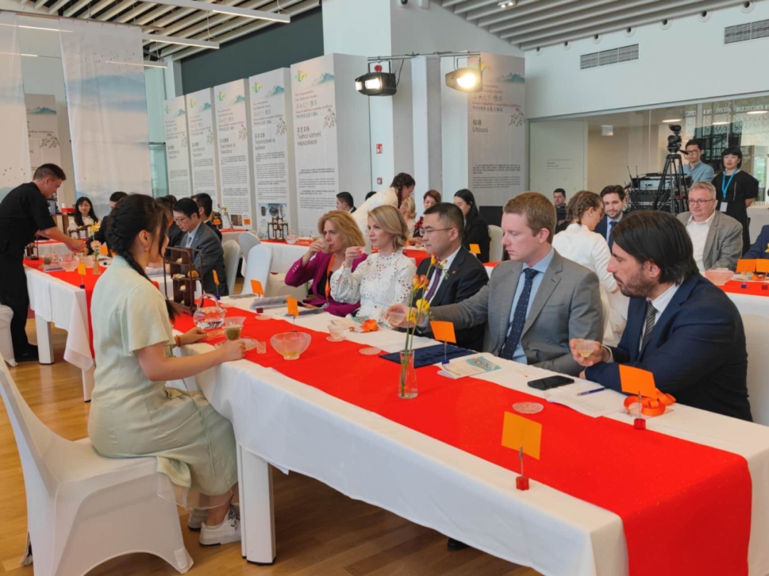 匈牙利罗兰大学与匈牙利帕兹玛尼彼得天主教大学中文系中文系的学生们为宾客进行了面对面冲泡技艺展示。嘉宾们“以茶会友”,体验了一场闻香、品茗、观展、听琴、论茶的“文雅之集会”。
