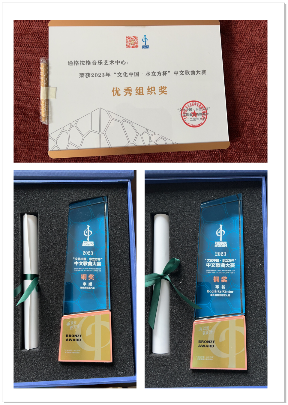 新导报讯:日前,在北京参加2023年“文化中国·水立方杯”中文歌曲大赛北京总决赛系列活动的通格拉格老师回到布达佩斯,向海外赛区成人组铜奖获得者字媛、外籍友人组铜奖获得者布谷,转发了万里迢迢带回的厚重的奖杯和奖状。匈牙利赛区承办单位通格拉格音乐艺术中心获得优秀组织奖。