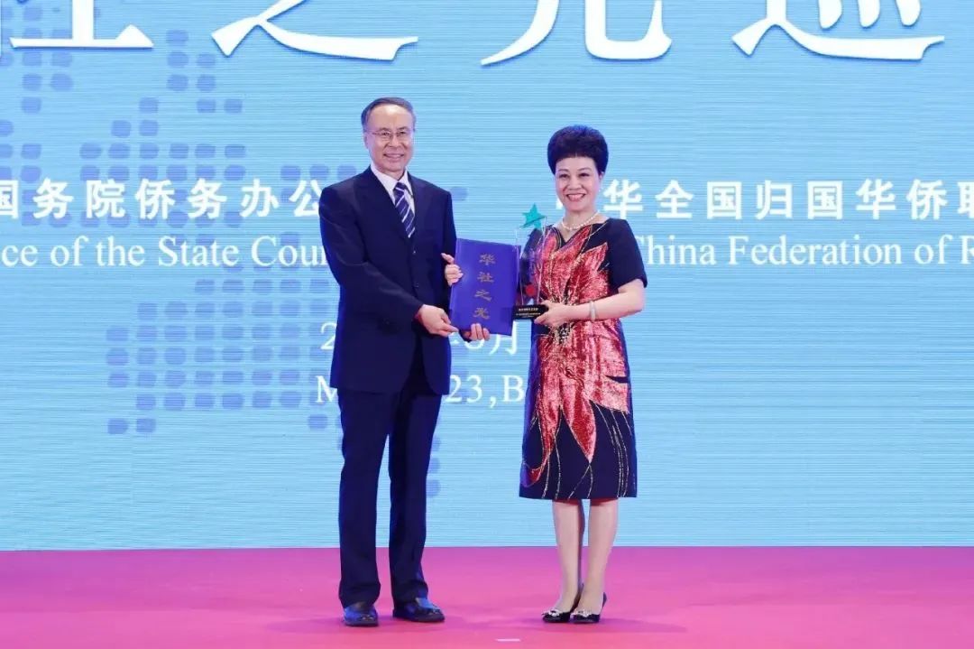 2023年5月9日,正在北京参加第十届世界华侨华人社团联谊大会的匈牙利华星艺术团团长施艳卫,从中国侨联万立骏主席的手里接过“华社之光”全球十佳华人社团荣誉称号。