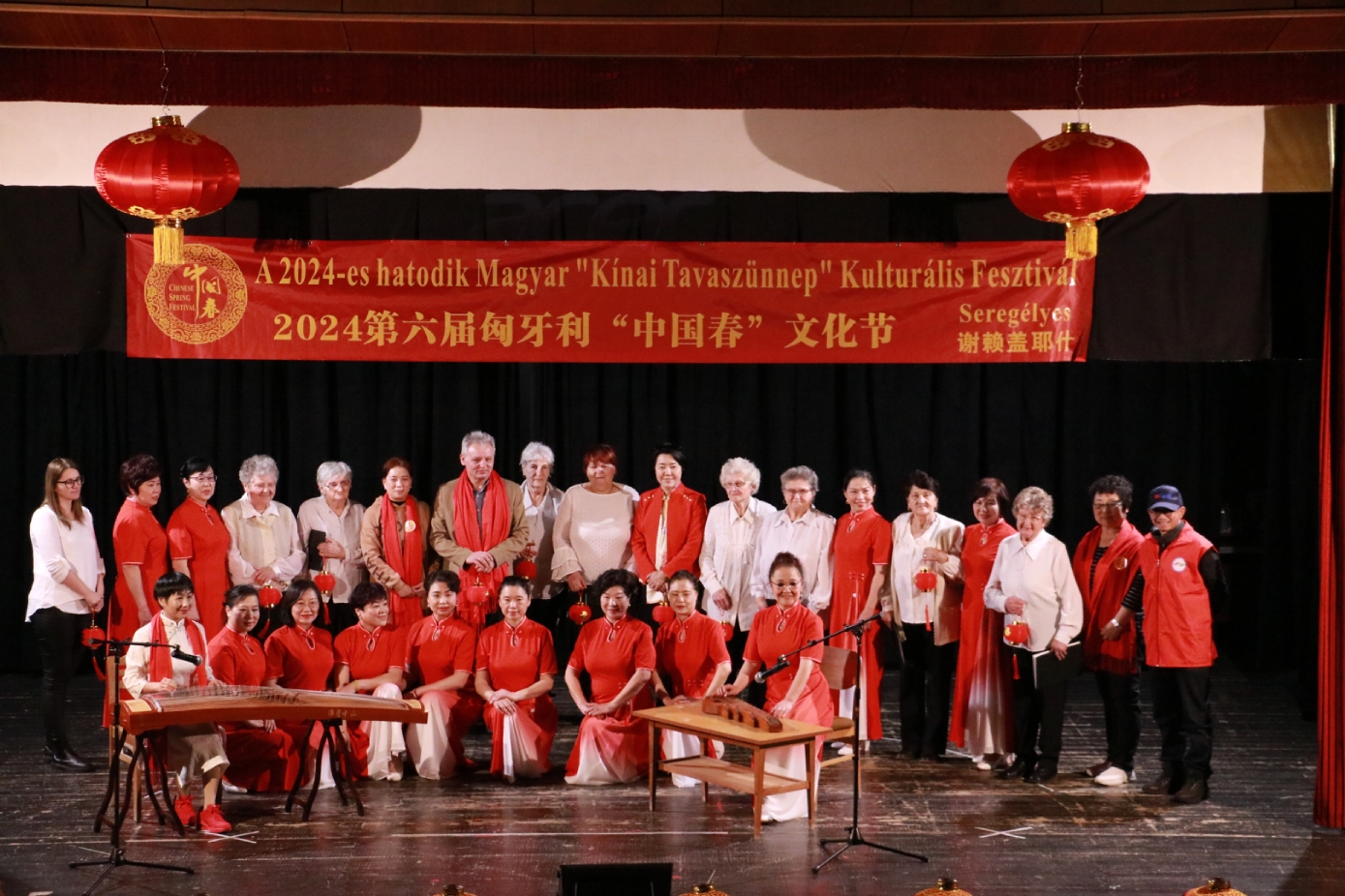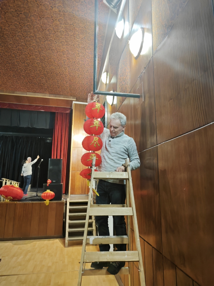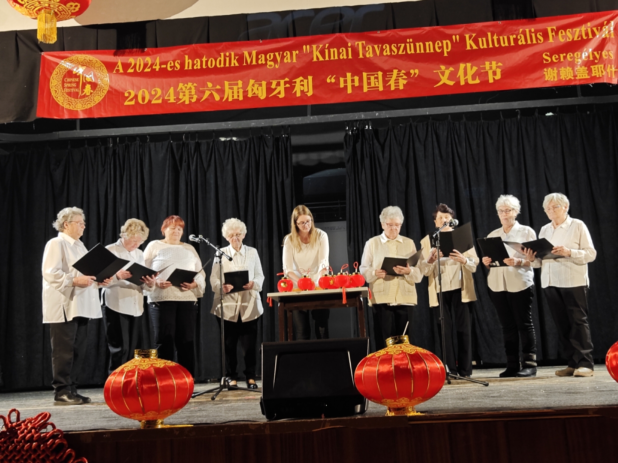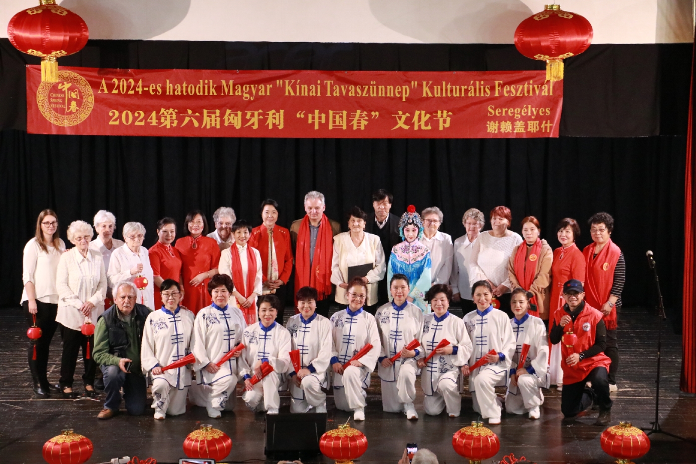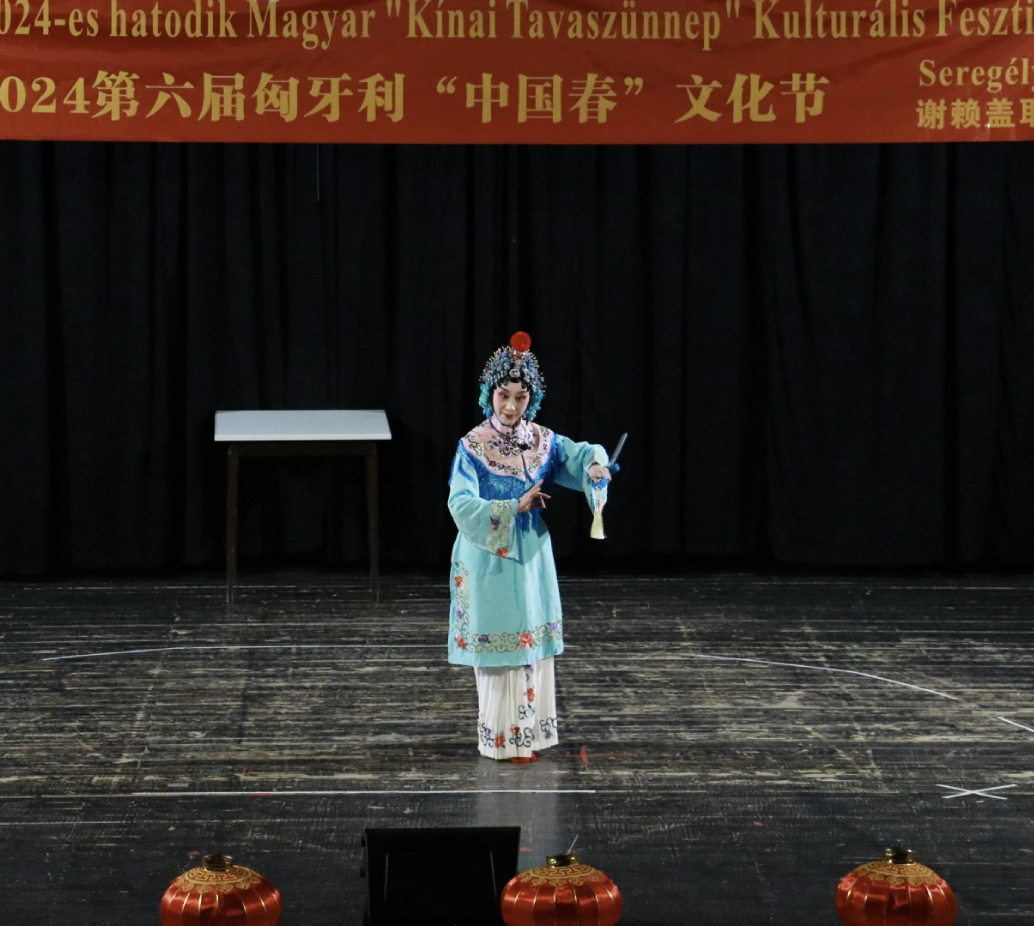在谢赖盖耶什市(Seregélyes)文化馆外的草坪上,“杀猪节”的香肠、熏肉、火腿制作和比赛活动热火朝天;文化馆内,大红灯笼、中国结、五星红旗、福字、春联也把中国春节气氛拉得满满,中医药保健品展示、茶艺、中国民俗工艺品发放、中国饮食品尝等受到民众欢迎。在文化馆的剧场舞台上,匈牙利中国民族文化艺术学院和匈牙利旗袍总会的众姐妹们为当地民众表演了极具中国民族特色的腰鼓、太极扇、旗袍舞等,并与该市退休人员合唱团和奇特琴乐队共同演奏、合唱了中国歌曲《茉莉花》、匈牙利歌曲《春天的风》;袁僩教授带妆京剧《红拂传》选段表演,更是让观众充分领略了中国传统艺术的美轮美奂;华侨顷先生也现场吹奏了轻松的萨克斯乐。