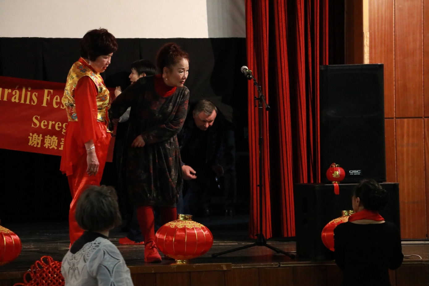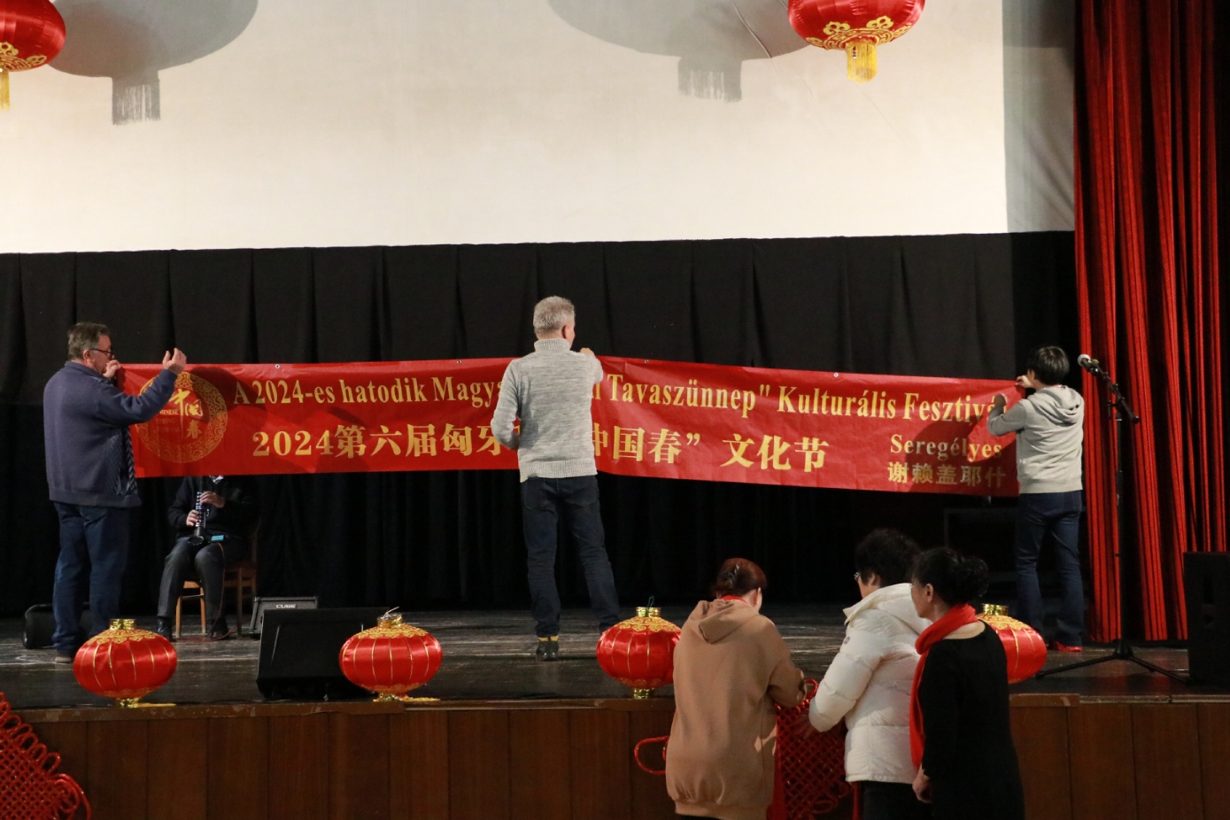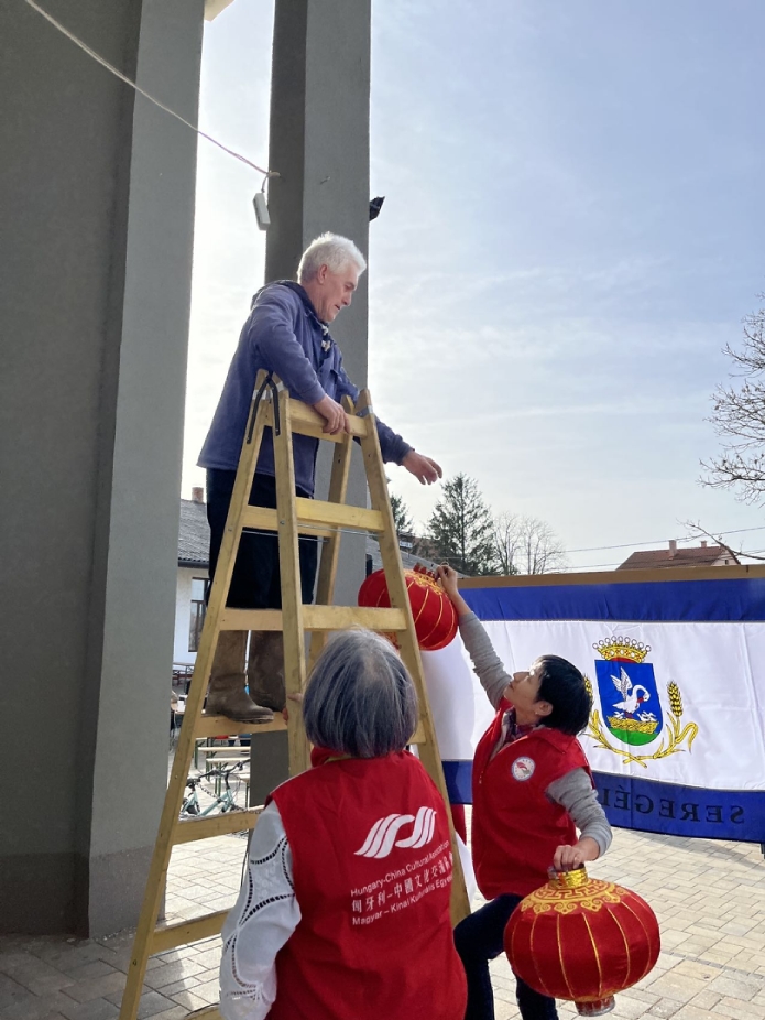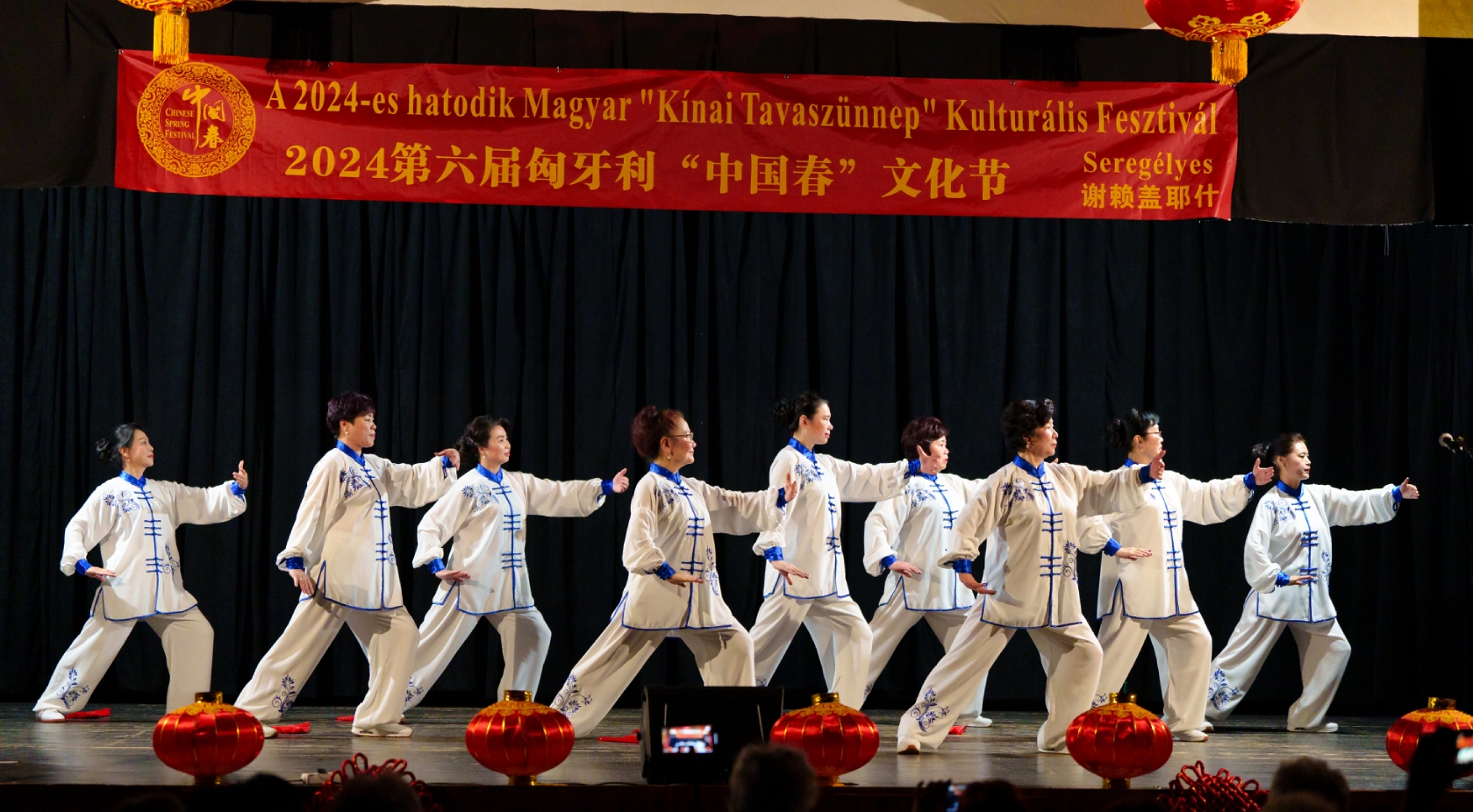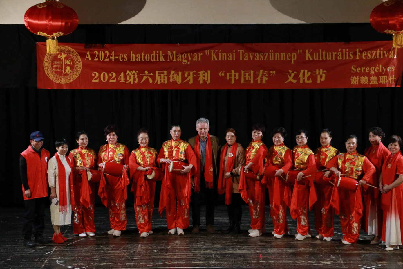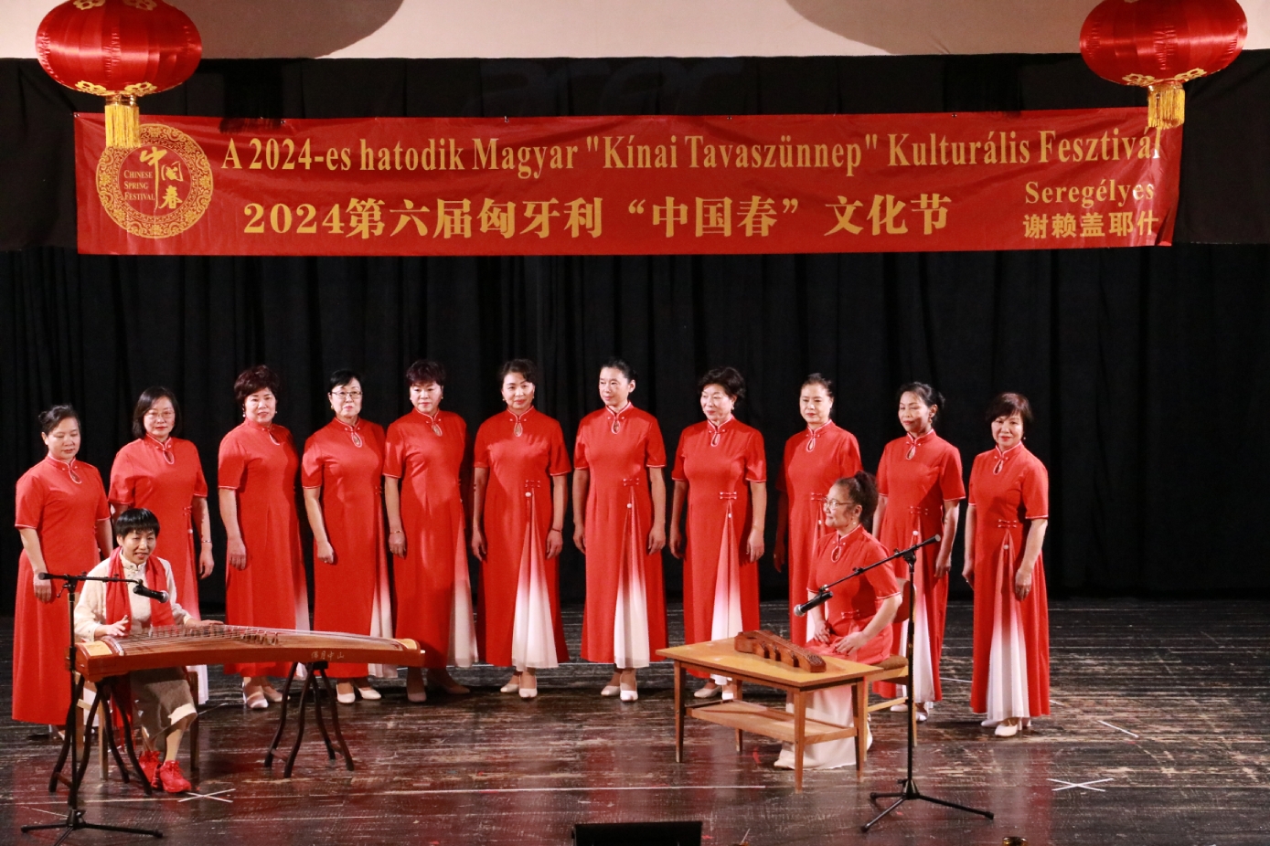 在谢赖盖耶什市(Seregélyes)文化馆外的草坪上,“杀猪节”的香肠、熏肉、火腿制作和比赛活动热火朝天;文化馆内,大红灯笼、中国结、五星红旗、福字、春联也把中国春节气氛拉得满满,中医药保健品展示、茶艺、中国民俗工艺品发放、中国饮食品尝等受到民众欢迎。在文化馆的剧场舞台上,匈牙利中国民族文化艺术学院和匈牙利旗袍总会的众姐妹们为当地民众表演了极具中国民族特色的腰鼓、太极扇、旗袍舞等,并与该市退休人员合唱团和奇特琴乐队共同演奏、合唱了中国歌曲《茉莉花》、匈牙利歌曲《春天的风》;袁僩教授带妆京剧《红拂传》选段表演,更是让观众充分领略了中国传统艺术的美轮美奂;华侨顷先生也现场吹奏了轻松的萨克斯乐。