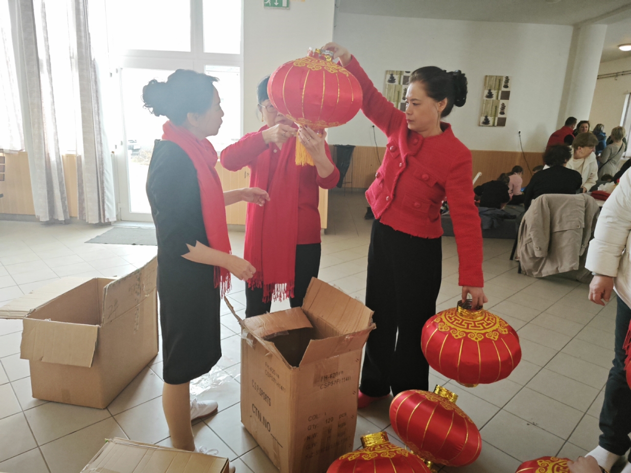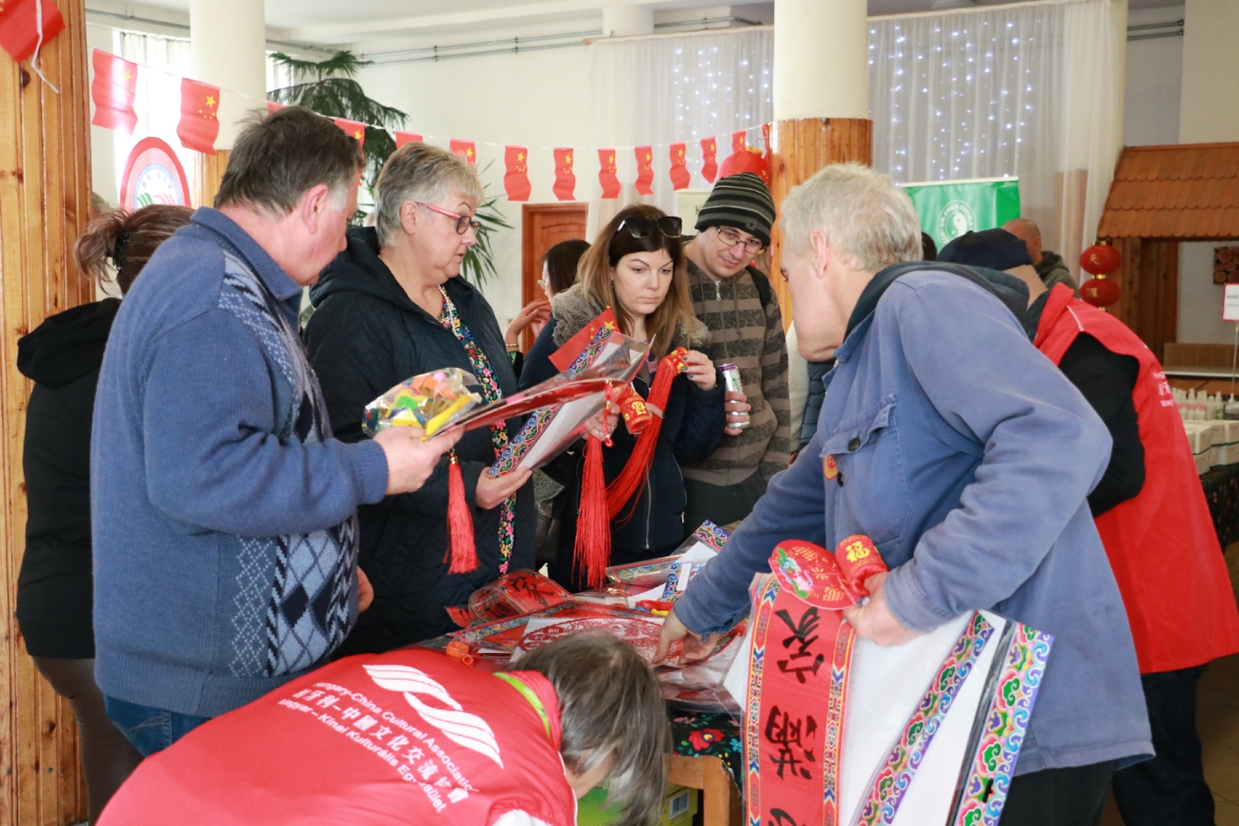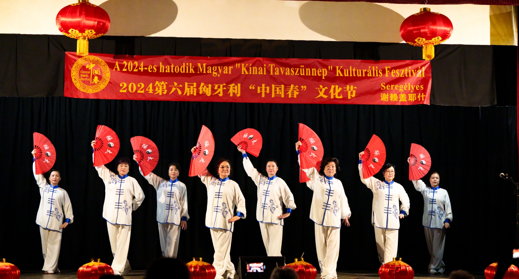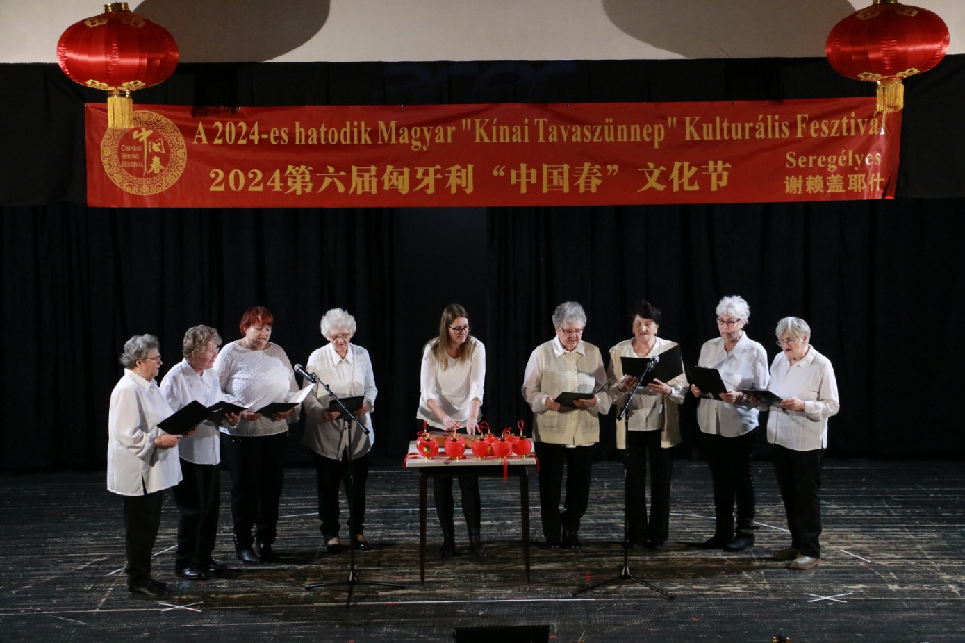 在谢赖盖耶什市(Seregélyes)文化馆外的草坪上,“杀猪节”的香肠、熏肉、火腿制作和比赛活动热火朝天;文化馆内,大红灯笼、中国结、五星红旗、福字、春联也把中国春节气氛拉得满满,中医药保健品展示、茶艺、中国民俗工艺品发放、中国饮食品尝等受到民众欢迎。在文化馆的剧场舞台上,匈牙利中国民族文化艺术学院和匈牙利旗袍总会的众姐妹们为当地民众表演了极具中国民族特色的腰鼓、太极扇、旗袍舞等,并与该市退休人员合唱团和奇特琴乐队共同演奏、合唱了中国歌曲《茉莉花》、匈牙利歌曲《春天的风》;袁僩教授带妆京剧《红拂传》选段表演,更是让观众充分领略了中国传统艺术的美轮美奂;华侨顷先生也现场吹奏了轻松的萨克斯乐。