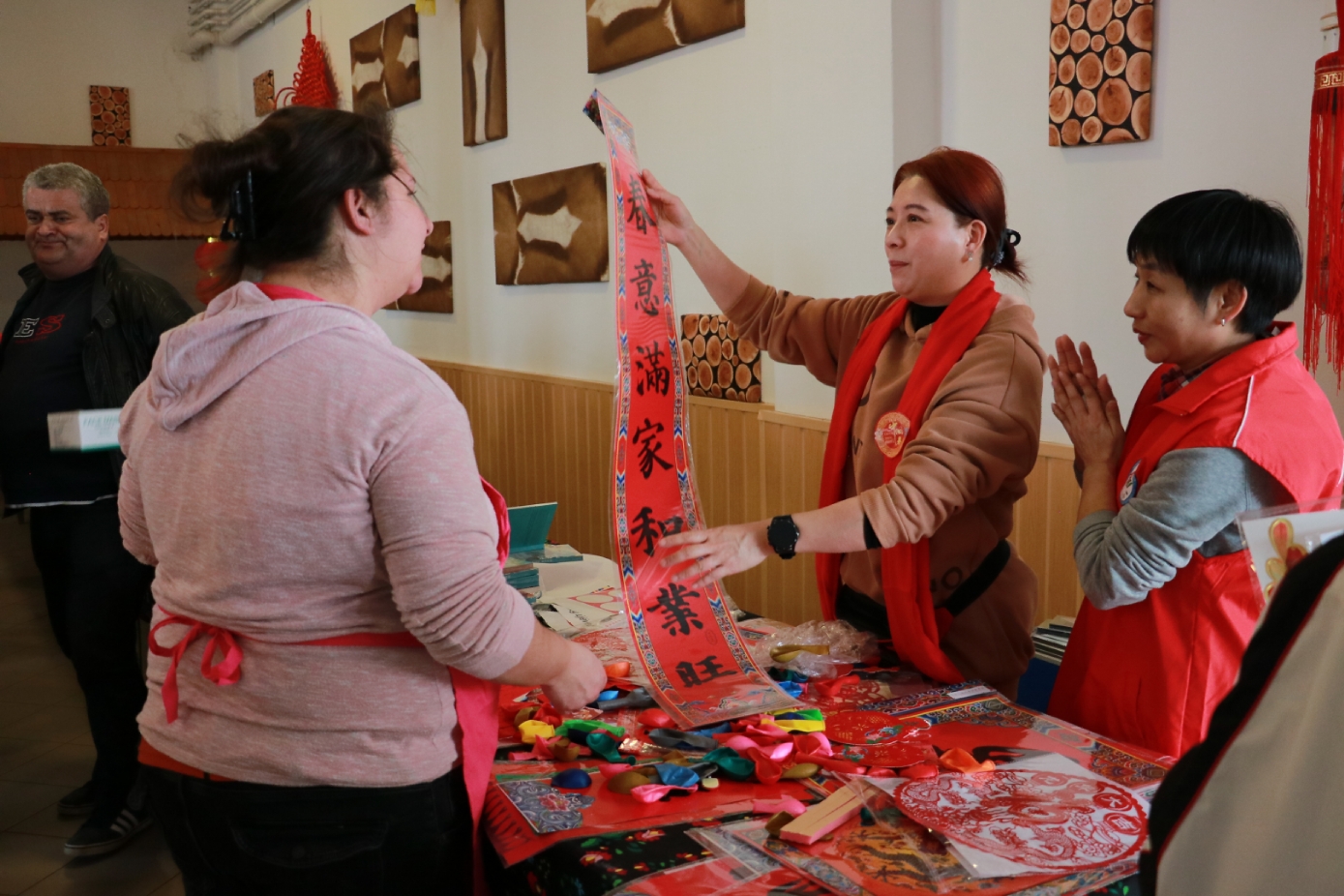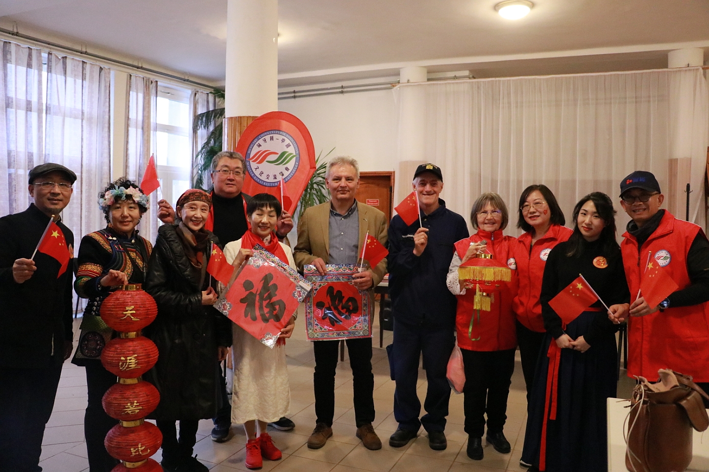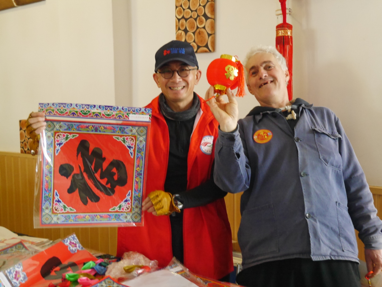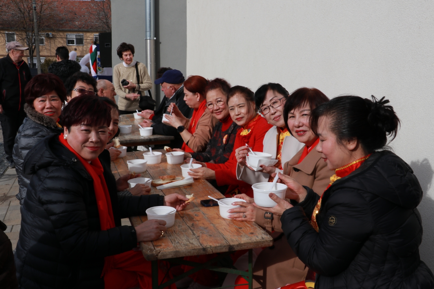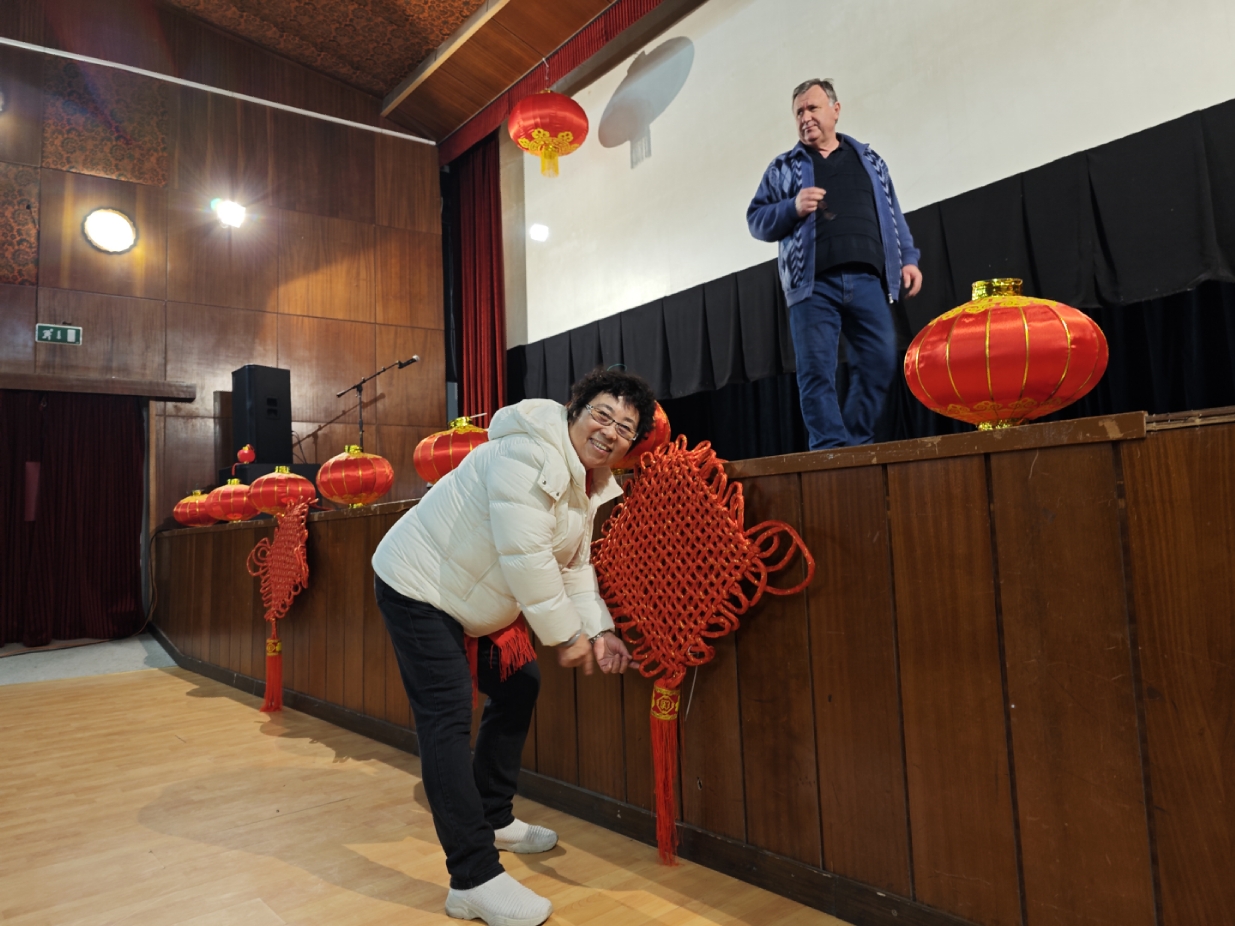在谢赖盖耶什市(Seregélyes)文化馆外的草坪上,“杀猪节”的香肠、熏肉、火腿制作和比赛活动热火朝天;文化馆内,大红灯笼、中国结、五星红旗、福字、春联也把中国春节气氛拉得满满,中医药保健品展示、茶艺、中国民俗工艺品发放、中国饮食品尝等受到民众欢迎。在文化馆的剧场舞台上,匈牙利中国民族文化艺术学院和匈牙利旗袍总会的众姐妹们为当地民众表演了极具中国民族特色的腰鼓、太极扇、旗袍舞等,并与该市退休人员合唱团和奇特琴乐队共同演奏、合唱了中国歌曲《茉莉花》、匈牙利歌曲《春天的风》;袁僩教授带妆京剧《红拂传》选段表演,更是让观众充分领略了中国传统艺术的美轮美奂;华侨顷先生也现场吹奏了轻松的萨克斯乐。