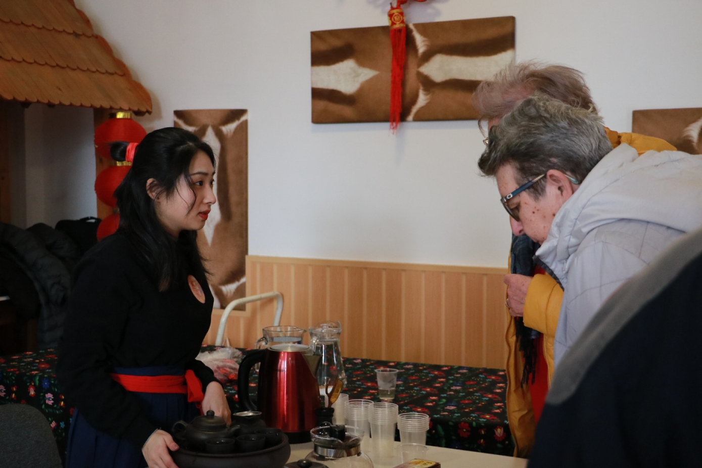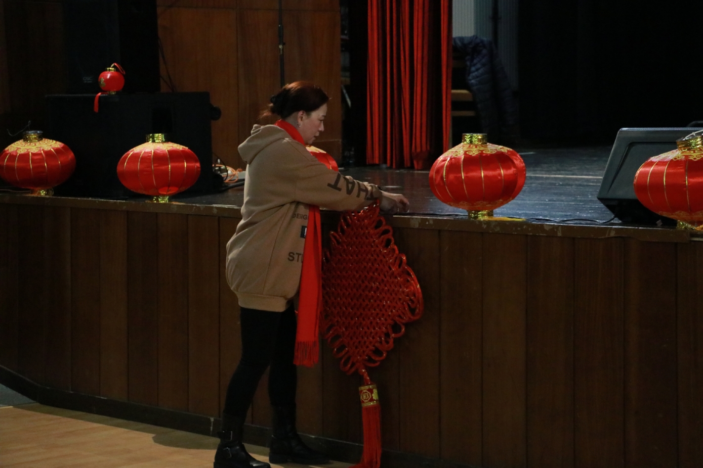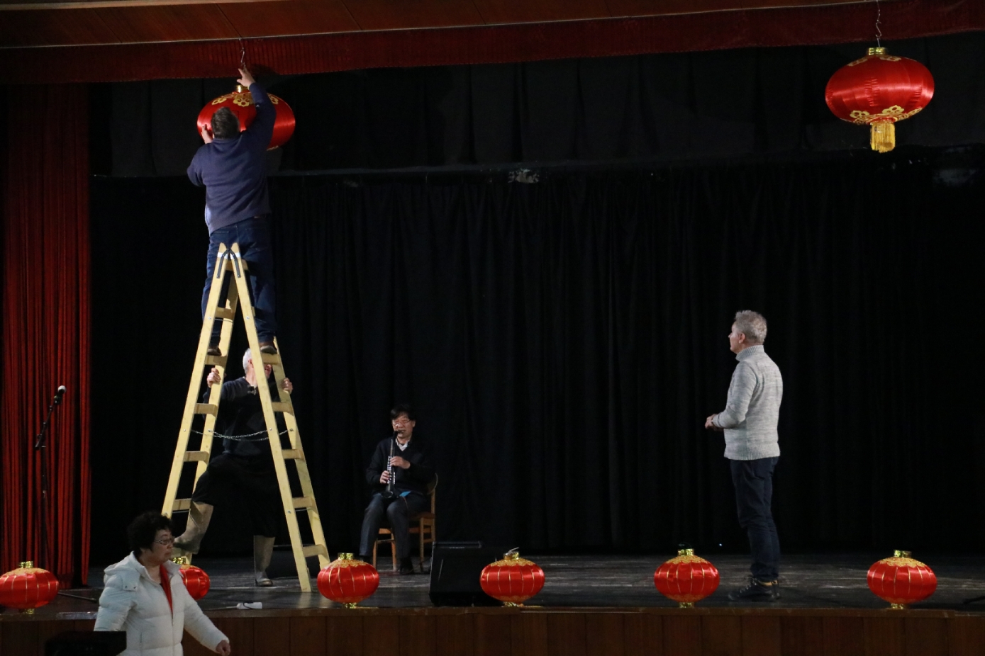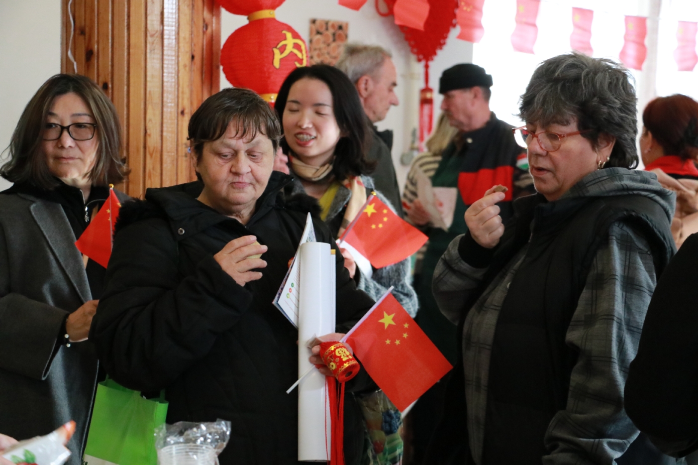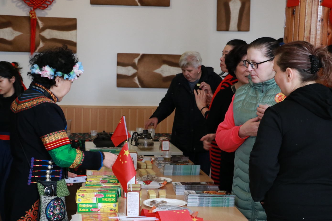 在谢赖盖耶什市(Seregélyes)文化馆外的草坪上,“杀猪节”的香肠、熏肉、火腿制作和比赛活动热火朝天;文化馆内,大红灯笼、中国结、五星红旗、福字、春联也把中国春节气氛拉得满满,中医药保健品展示、茶艺、中国民俗工艺品发放、中国饮食品尝等受到民众欢迎。在文化馆的剧场舞台上,匈牙利中国民族文化艺术学院和匈牙利旗袍总会的众姐妹们为当地民众表演了极具中国民族特色的腰鼓、太极扇、旗袍舞等,并与该市退休人员合唱团和奇特琴乐队共同演奏、合唱了中国歌曲《茉莉花》、匈牙利歌曲《春天的风》;袁僩教授带妆京剧《红拂传》选段表演,更是让观众充分领略了中国传统艺术的美轮美奂;华侨顷先生也现场吹奏了轻松的萨克斯乐。