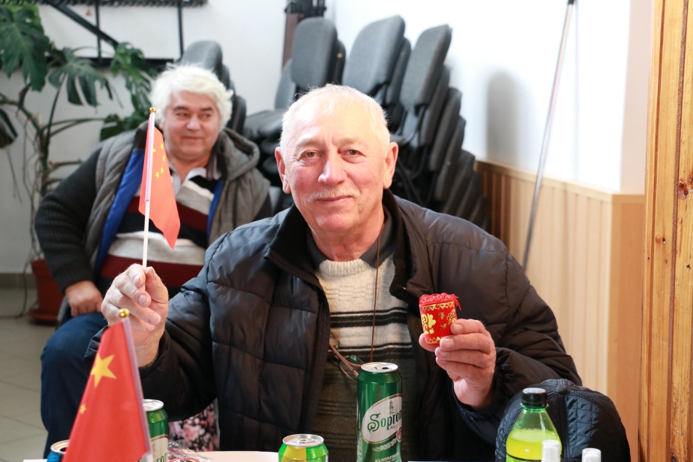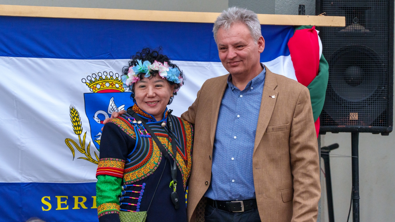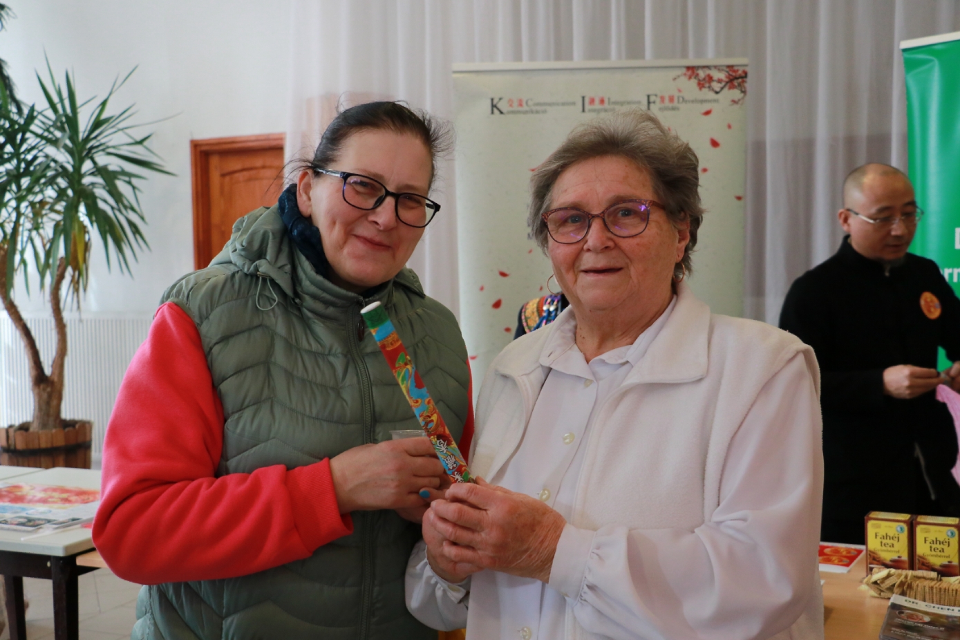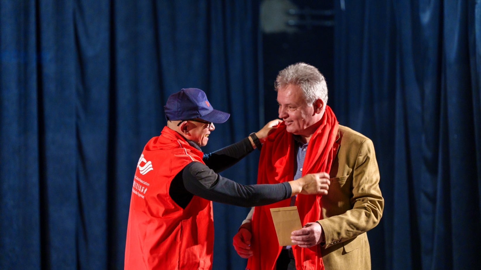 匈牙利-中国文化交流协会会长滕维杰(左)为谢赖盖耶什市(Seregélyes)市市长Horváth Sándor戴上中国红围巾(右)。