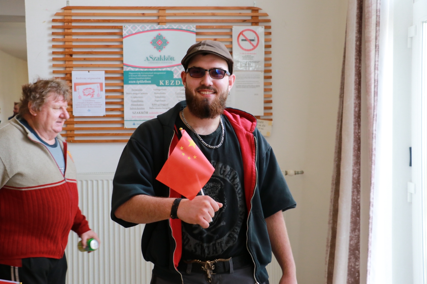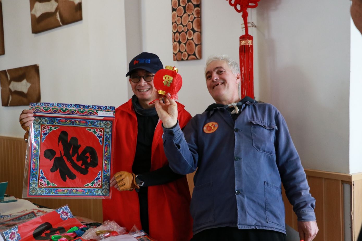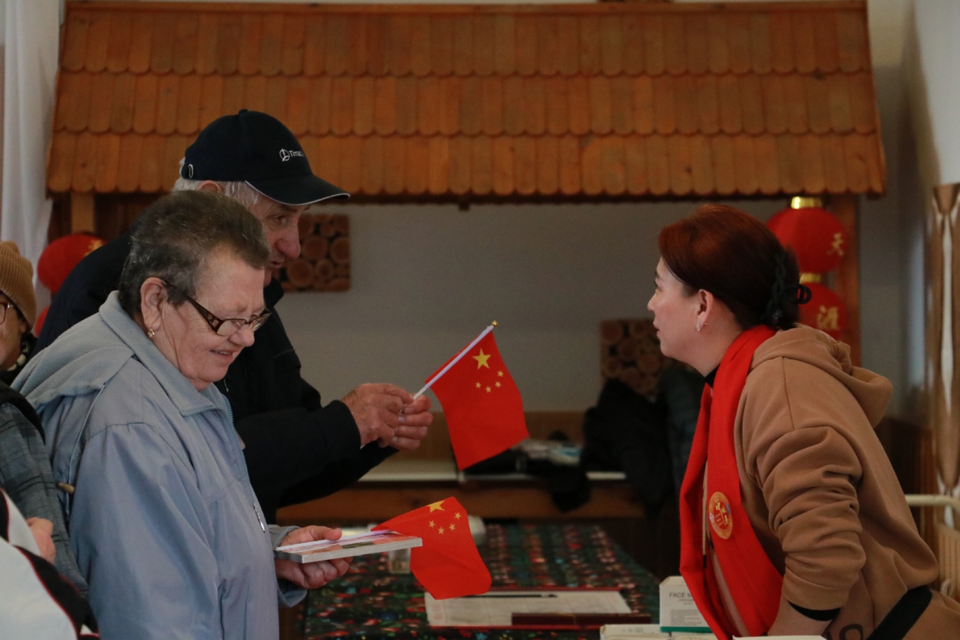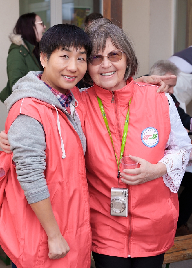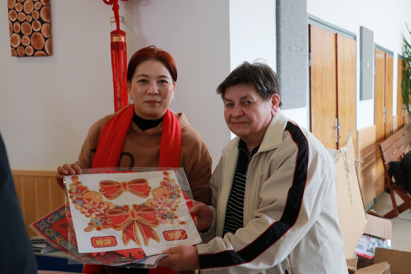 匈牙利-中国文化交流协会会长滕维杰(左)为谢赖盖耶什市(Seregélyes)市市长Horváth Sándor戴上中国红围巾(右)。