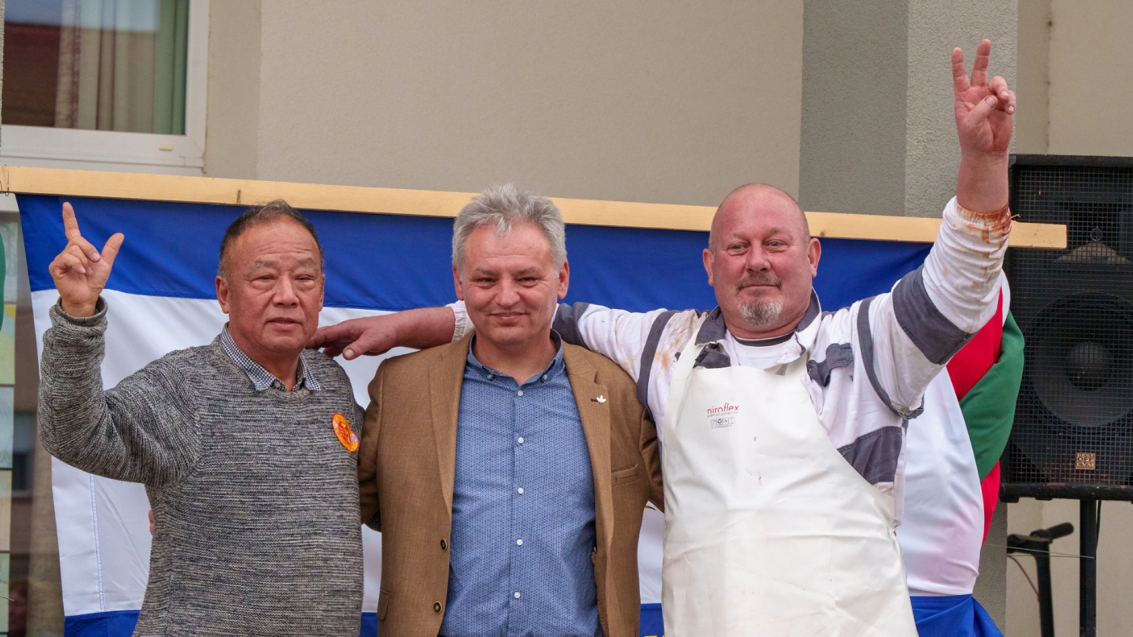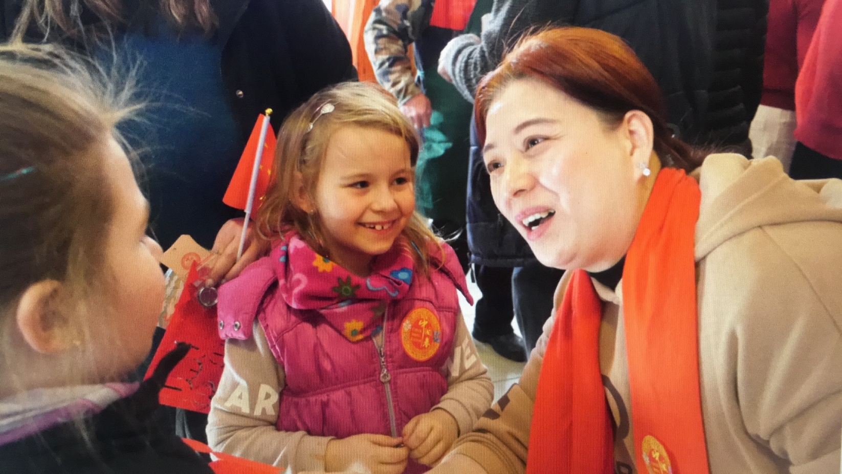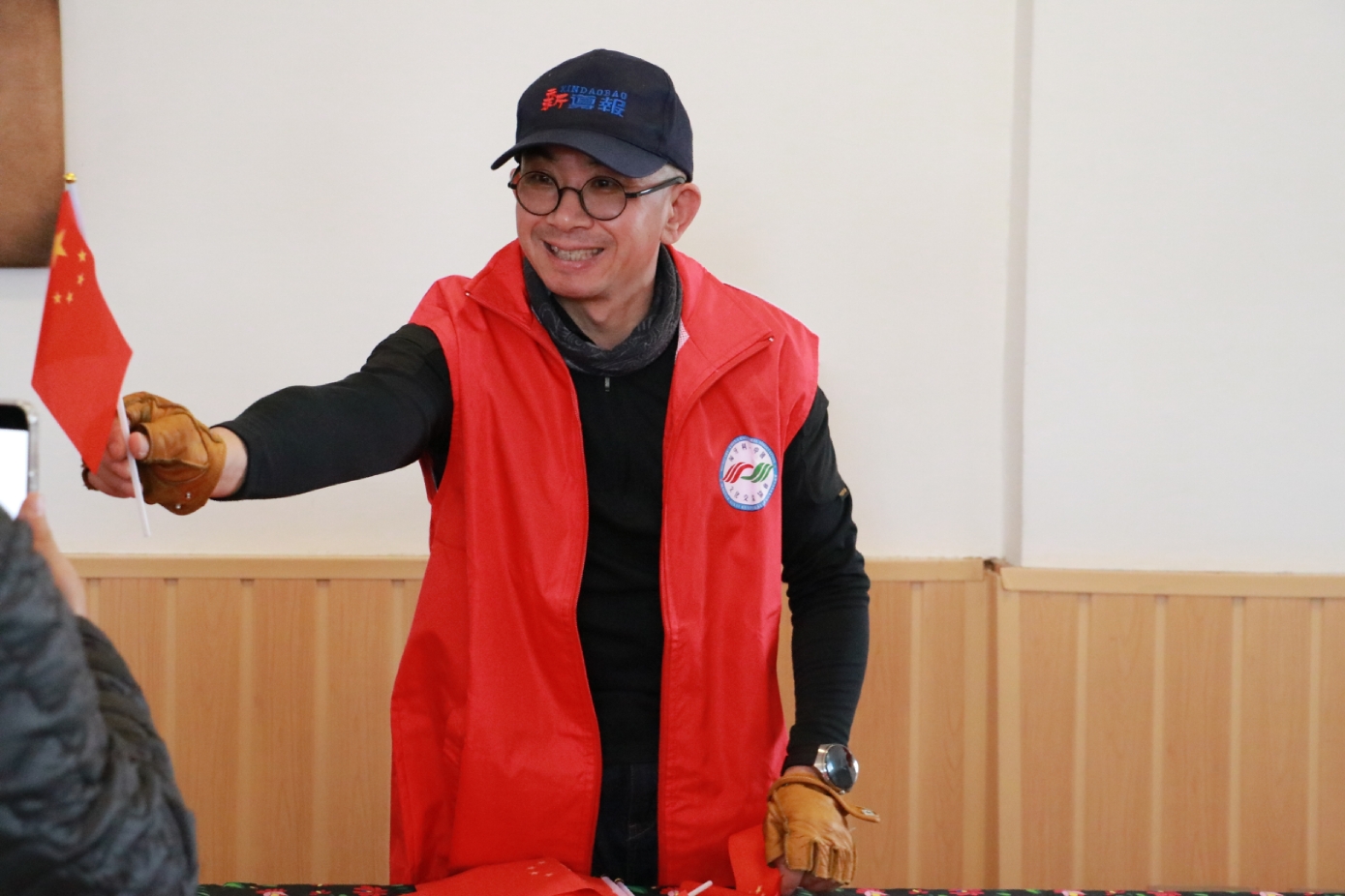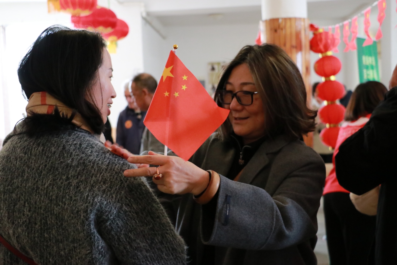 匈牙利-中国文化交流协会会长滕维杰(左)为谢赖盖耶什市(Seregélyes)市市长Horváth Sándor戴上中国红围巾(右)。