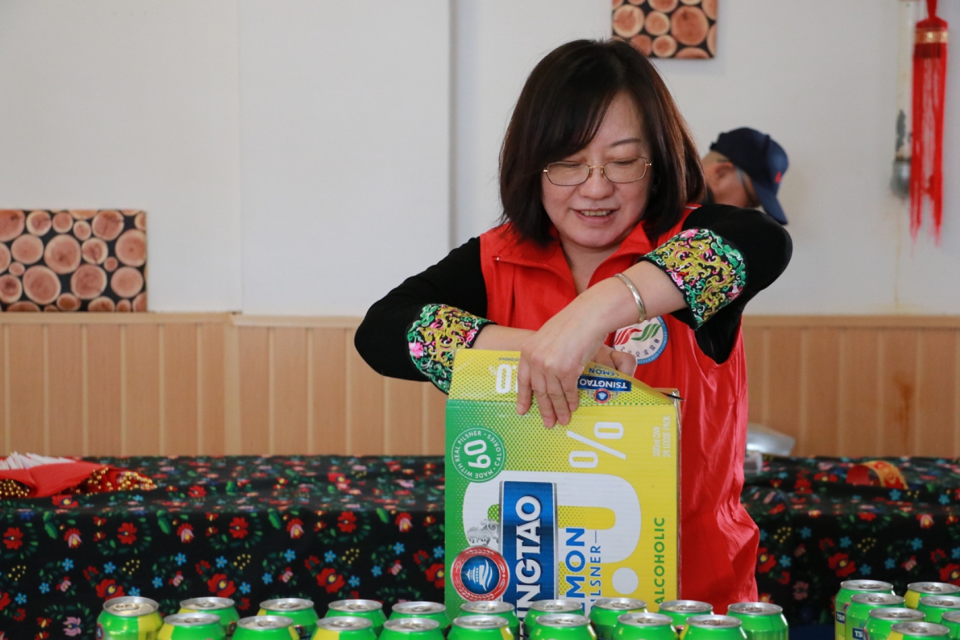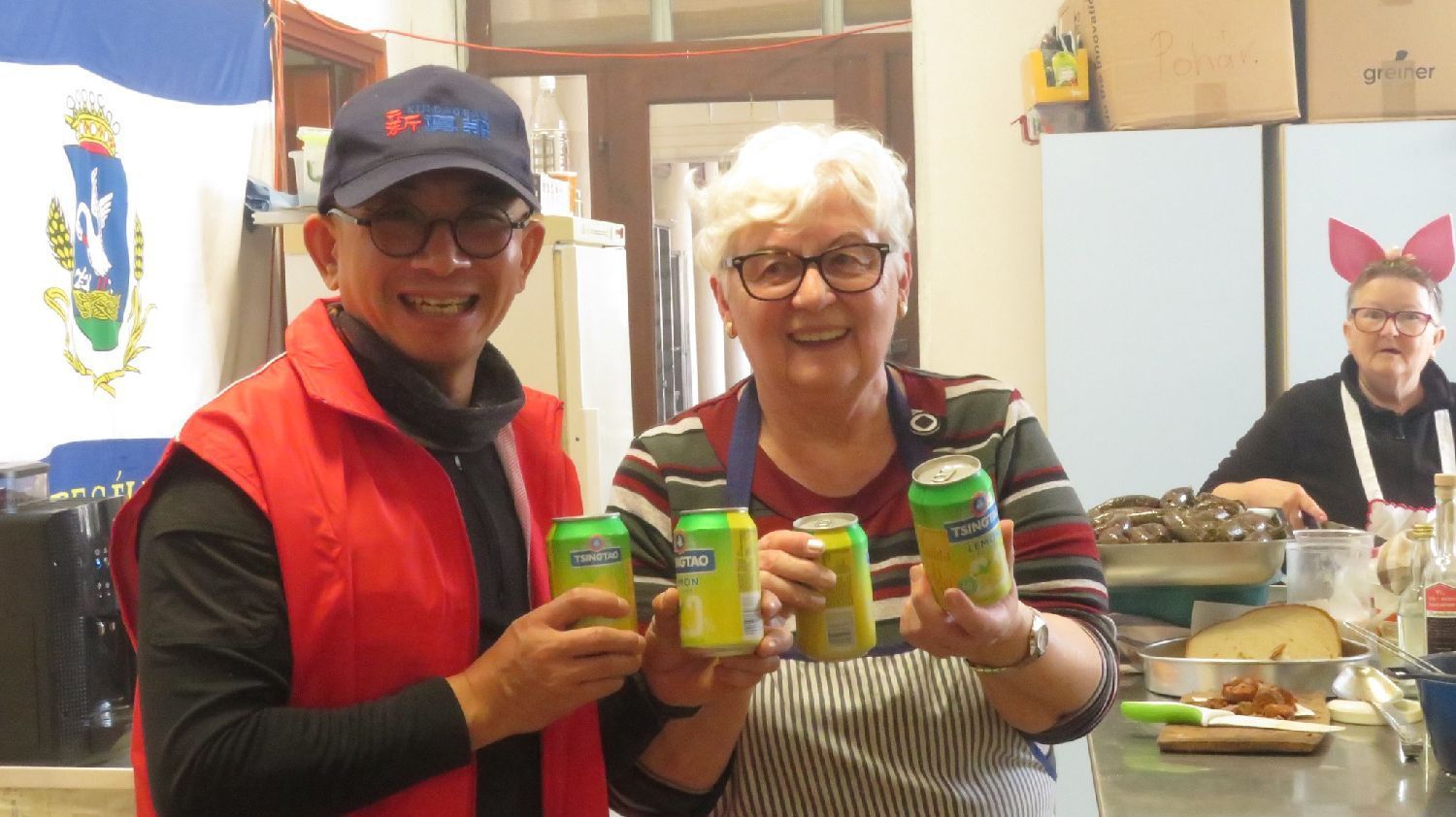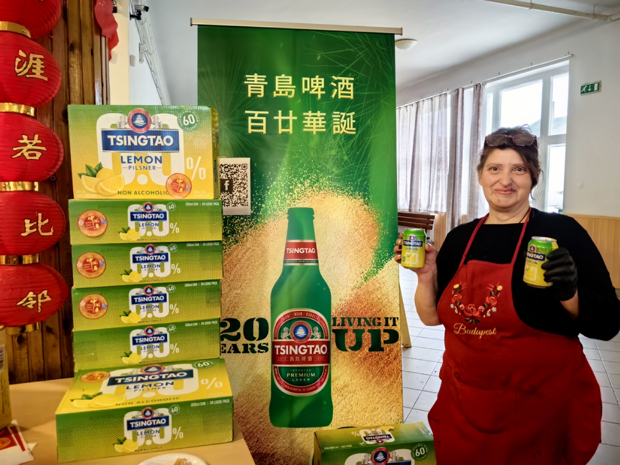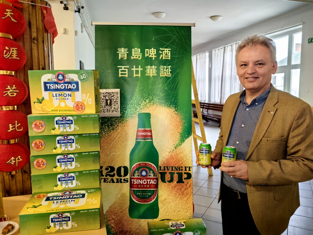 谢赖盖耶什市市长Horváth Sándor品尝无酒精青岛啤酒。