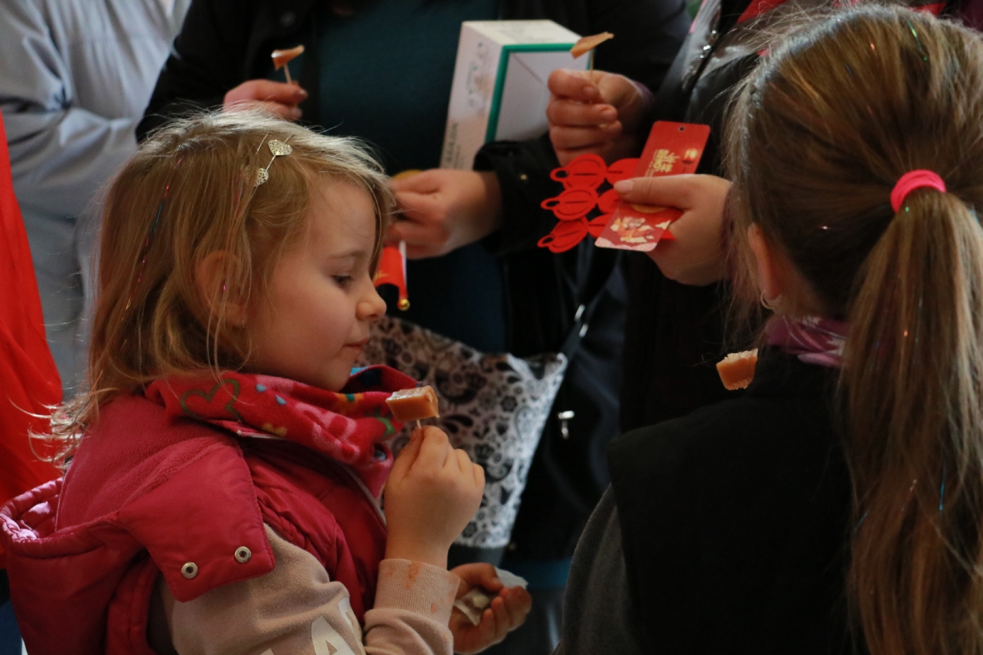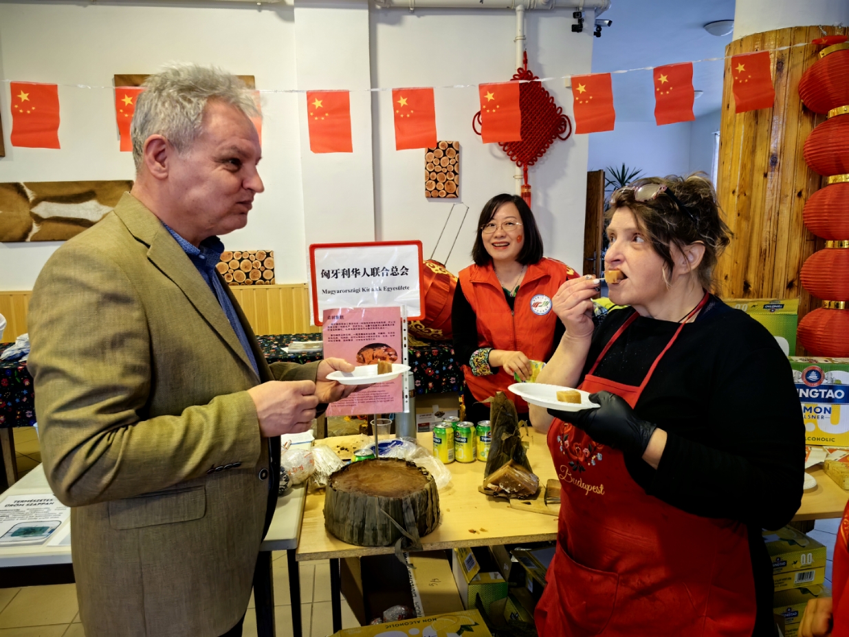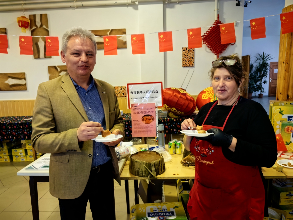 谢赖盖耶什市市长Horváth Sándor(左)和副市长Kajos Istvánné女士(右)品尝中国民间特色美食“青田糖糕”。