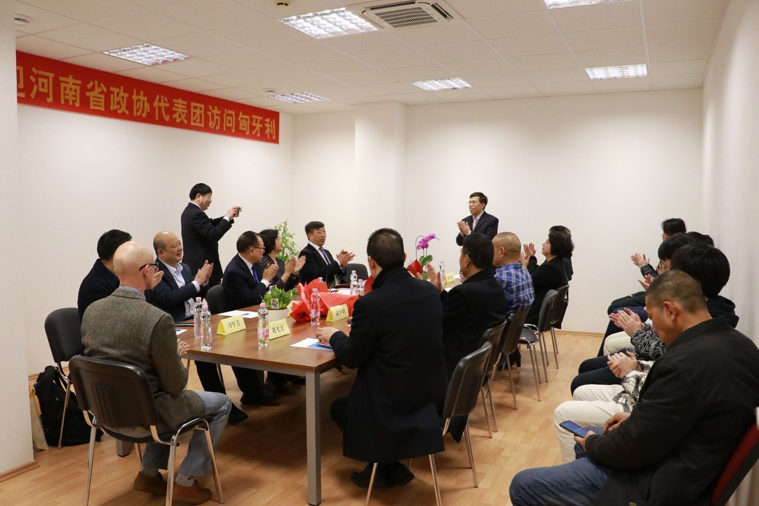 河南总商会代理会长、秘书长白勇,副会长王红英、葛开明、倪大岭、赵光红、应建辉,法律顾问和翻译阿迪拉以及部分豫商代表在布达佩斯瑞福大厦河南总商会会议室欢迎代表团一行的到来并举办座谈会。