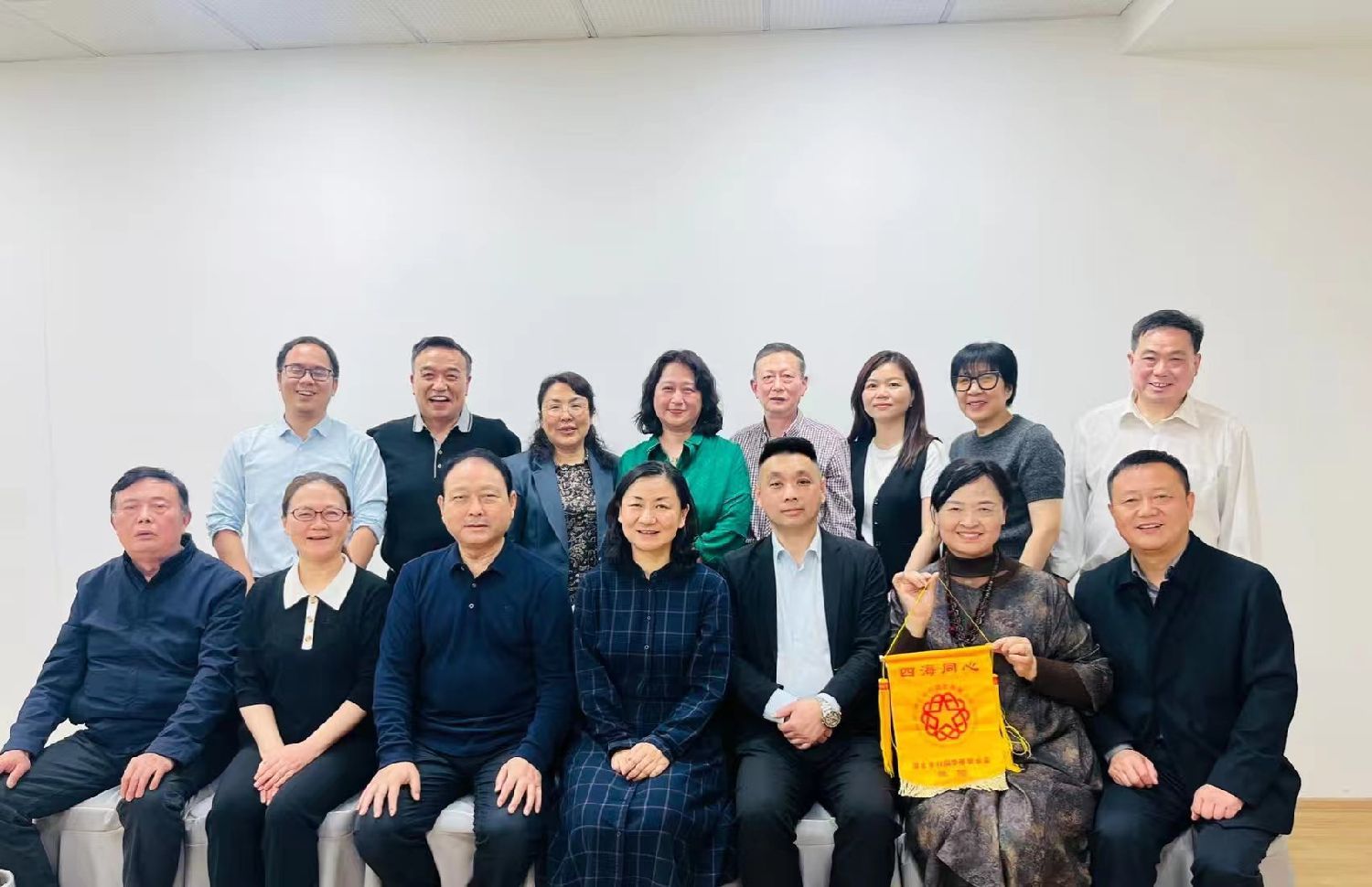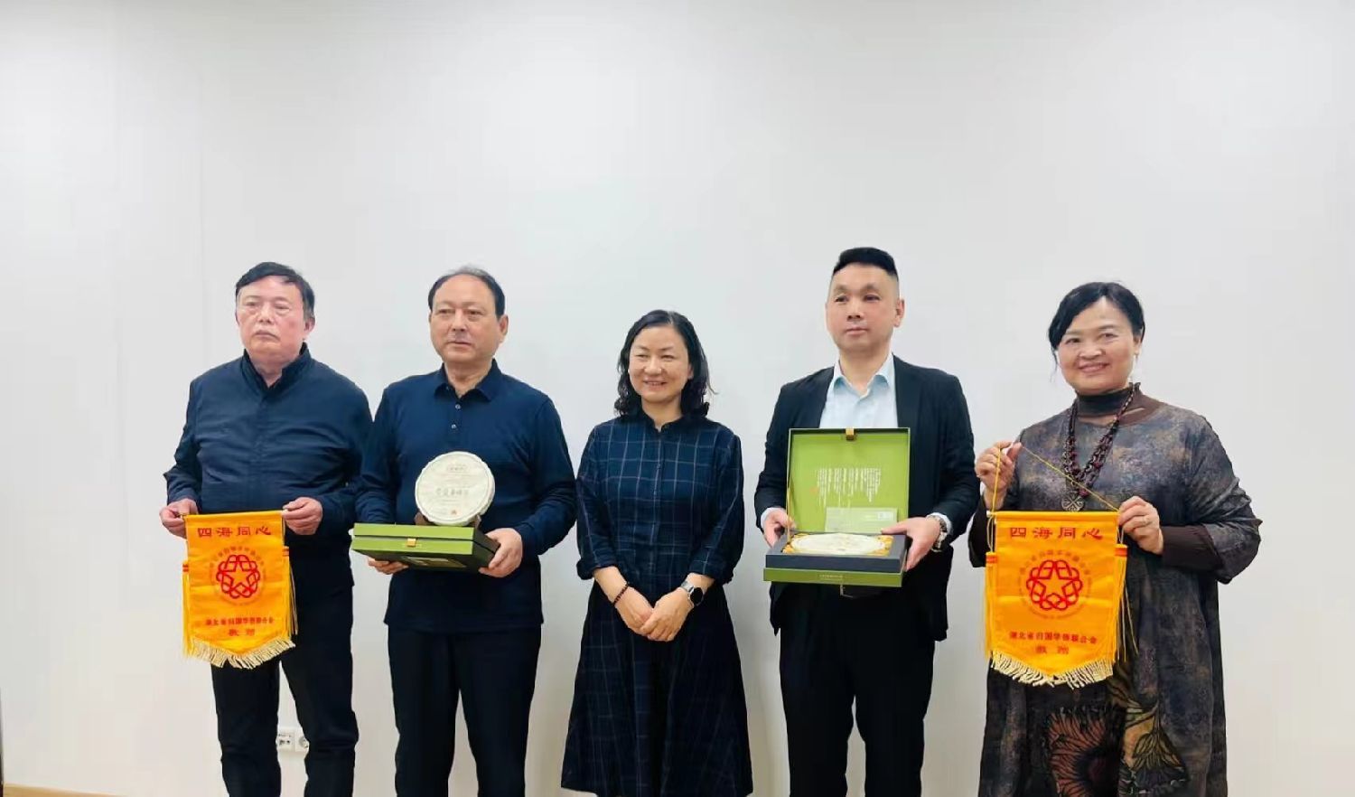 湖北省侨联副主席王慧萍女士(中)向匈牙利湖北同乡会会长李军博士和欧洲湖北总商会会长陈明洪先生赠送“四海同乡“的锦旗和湖北特产羊楼洞茶叶。