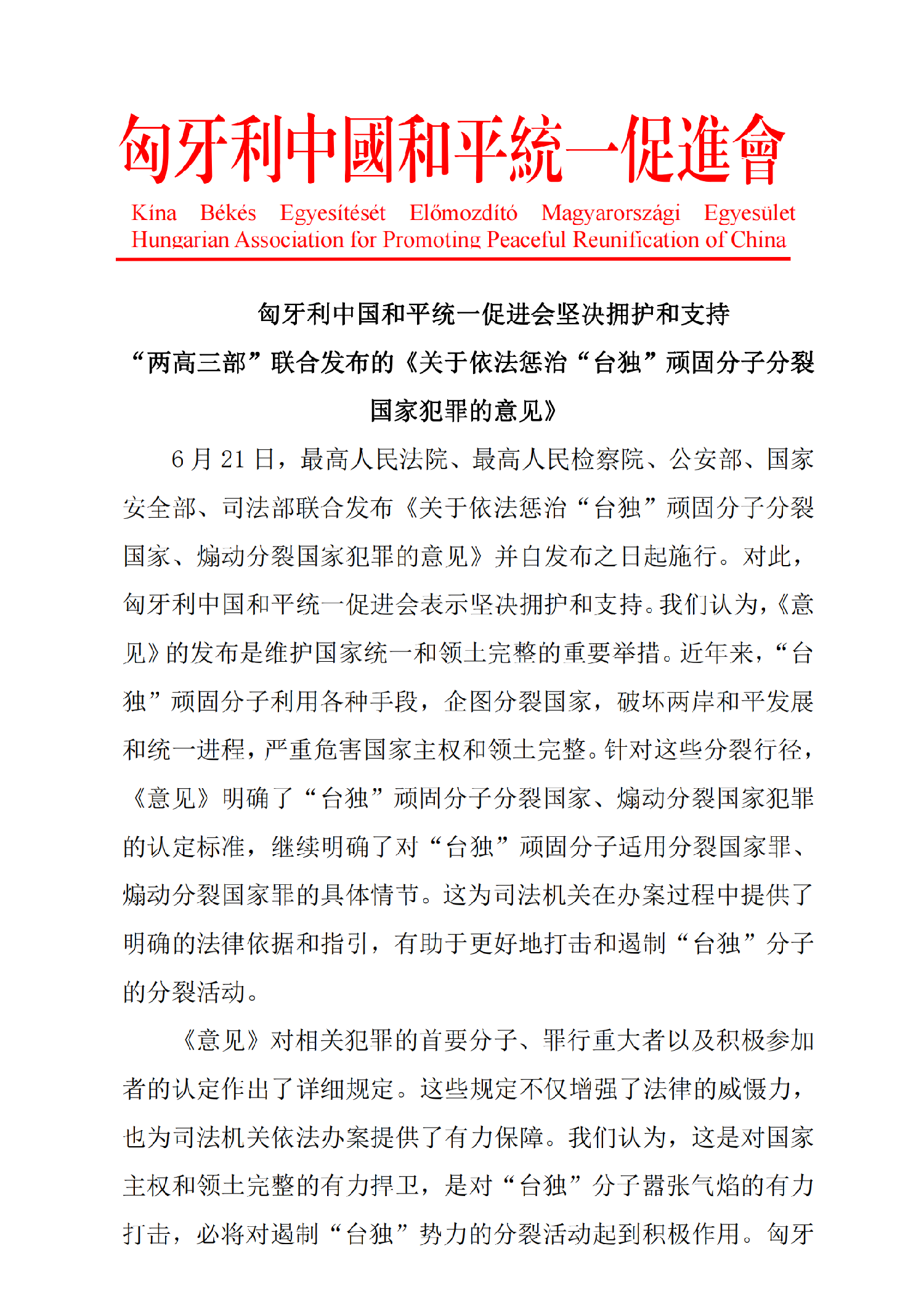 6月21日,最高人民法院、最高人民检察院、公安部、国家安全部、司法部联合发布《关于依法惩治“台独”顽固分子分裂国家、煽动分裂国家犯罪的意见》并自发布之日起施行。对此,匈牙利中国和平统一促进会表示坚决拥护和支持。我们认为,《意见》的发布是维护国家统一和领土完整的重要举措。近年来,“台独”顽固分子利用各种手段,企图分裂国家,破坏两岸和平发展和统一进程,严重危害国家主权和领土完整。针对这些分裂行径,《意见》明确了“台独”顽固分子分裂国家、煽动分裂国家犯罪的认定标准,继续明确了对“台独”顽固分子适用分裂国家罪、煽动分裂国家罪的具体情节。这为司法机关在办案过程中提供了明确的法律依据和指引,有助于更好地打击和遏制“台独”分子的分裂活动。