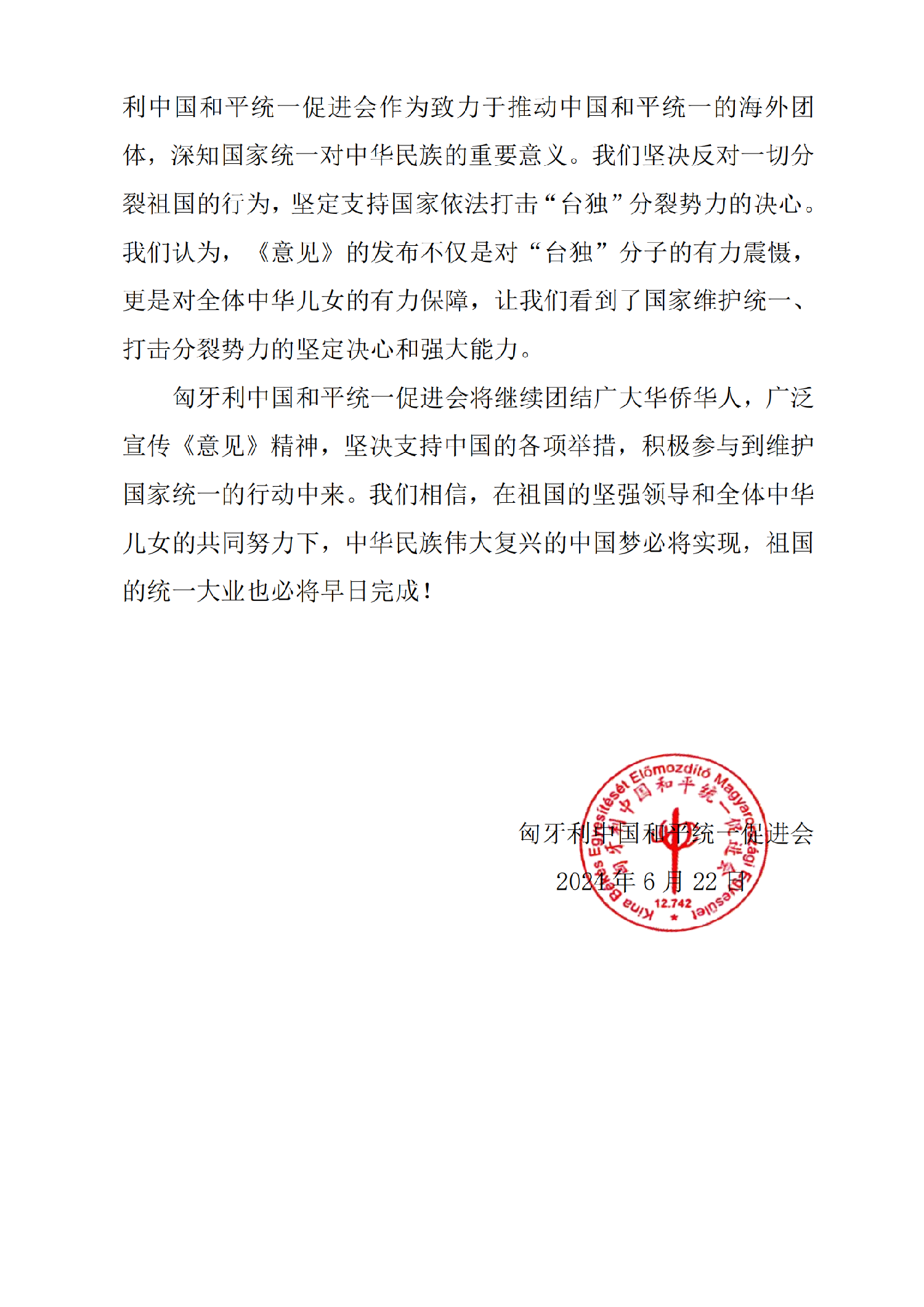 匈牙利中国和平统一促进会将继续团结广大华侨华人,广泛宣传《意见》精神,坚决支持中国的各项举措,积极参与到维护国家统一的行动中来。我们相信,在祖国的坚强领导和全体中华儿女的共同努力下,中华民族伟大复兴的中国梦必将实现,祖国的统一大业也必将早日完成!