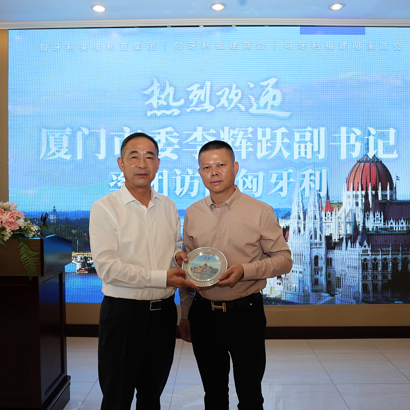 厦门市委副书记李辉跃(左)和匈牙利福建商会执行会长、匈牙利美维利亚集团创始人陈世全(右)互赠纪念品。