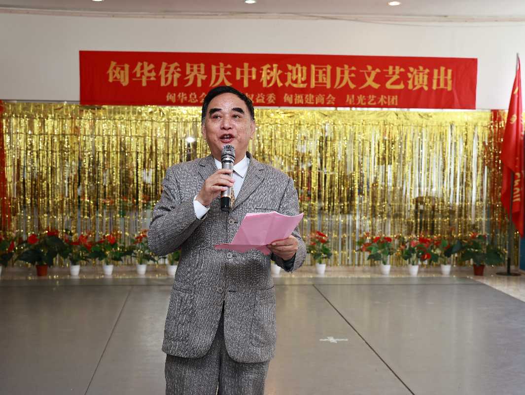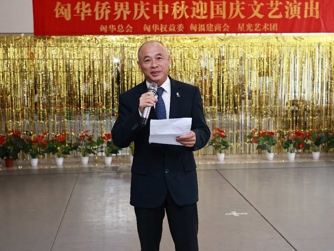 联欢活动由匈华总会副主席尤灯塔主持,他说“秋分时节来相聚,寒露确保得温暖,甲辰喜迎七五载,昌隆盛世我中华”,他代表匈华总会主席余美明、匈华权益委主席刘志辉欢迎各位嘉宾和华商莅临匈华总会会馆参加“匈华侨界庆中秋迎国庆的文艺演出”联欢活动。