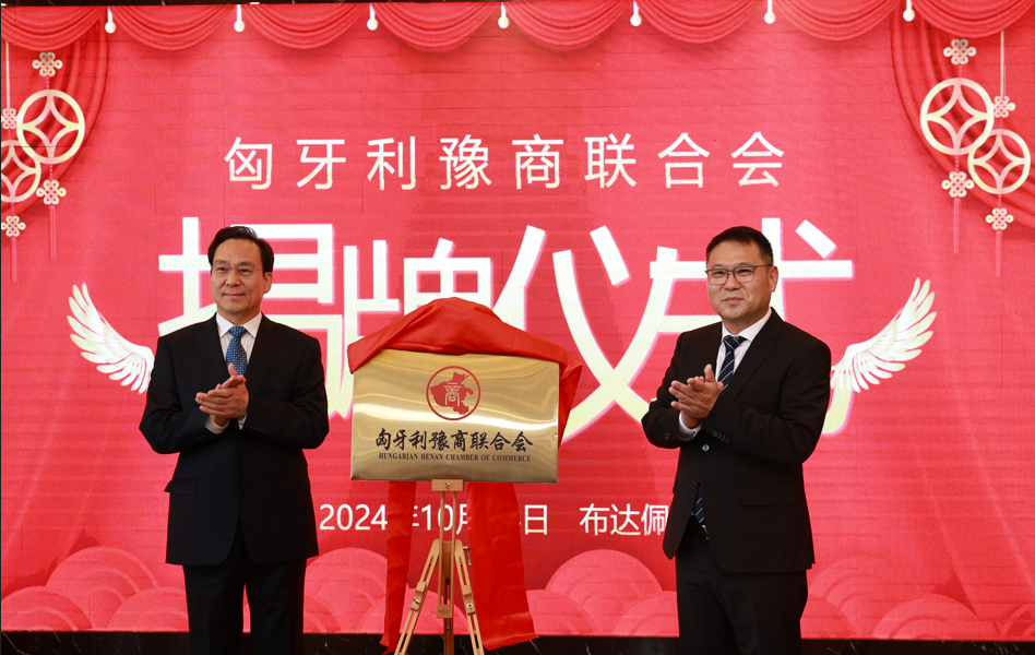 匈牙利豫商联合会揭牌仪式于2024年10月14日在匈牙利首都布达佩斯举行,河南省政协主席孔昌生先生、匈牙利豫商联合会会长刘卫杰先生为商会揭牌。