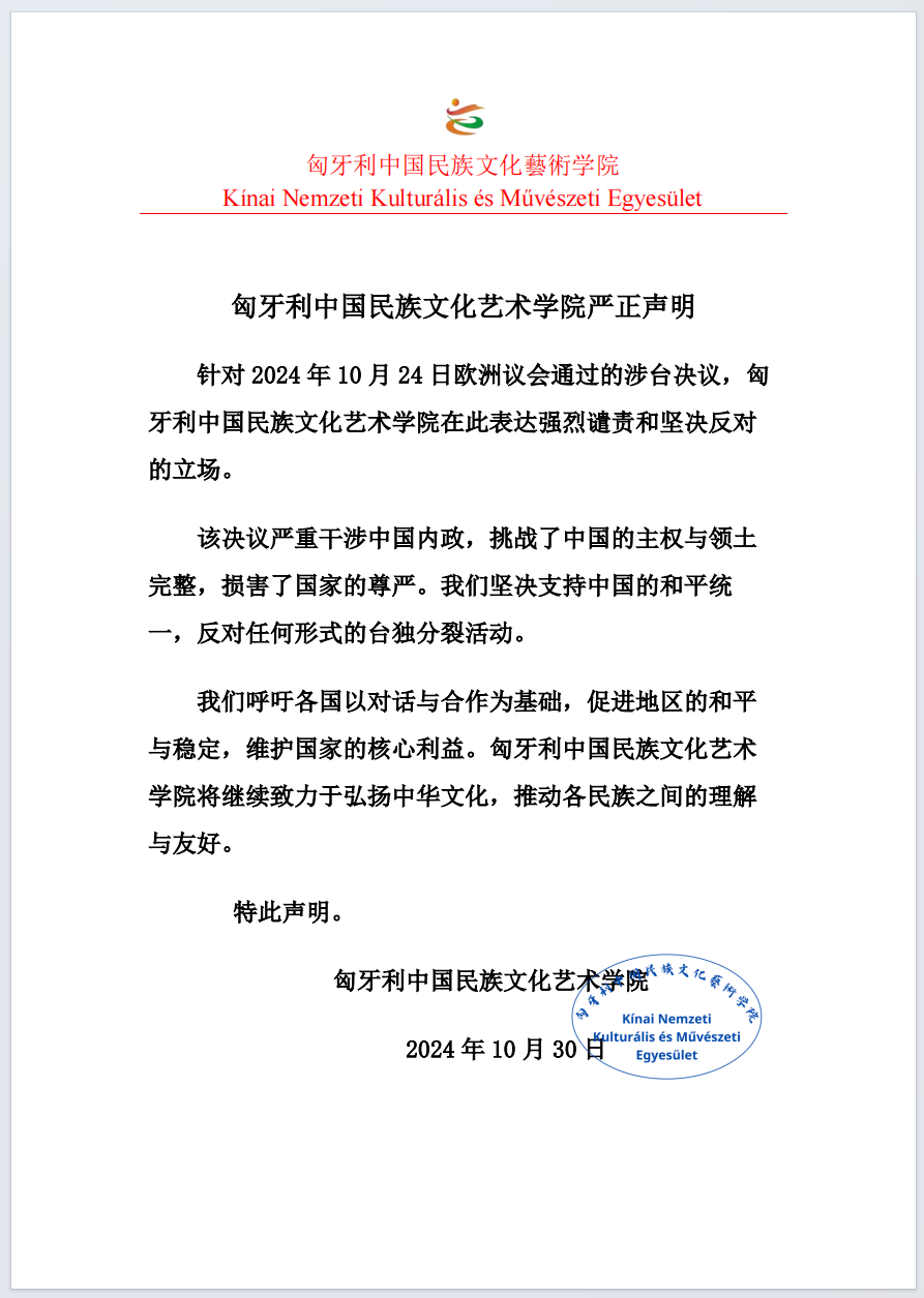 针对2024年10月24日欧洲议会通过的涉台决议,匈牙利中国民族文化艺术学院在此表达强烈谴责和坚决反对的立场。